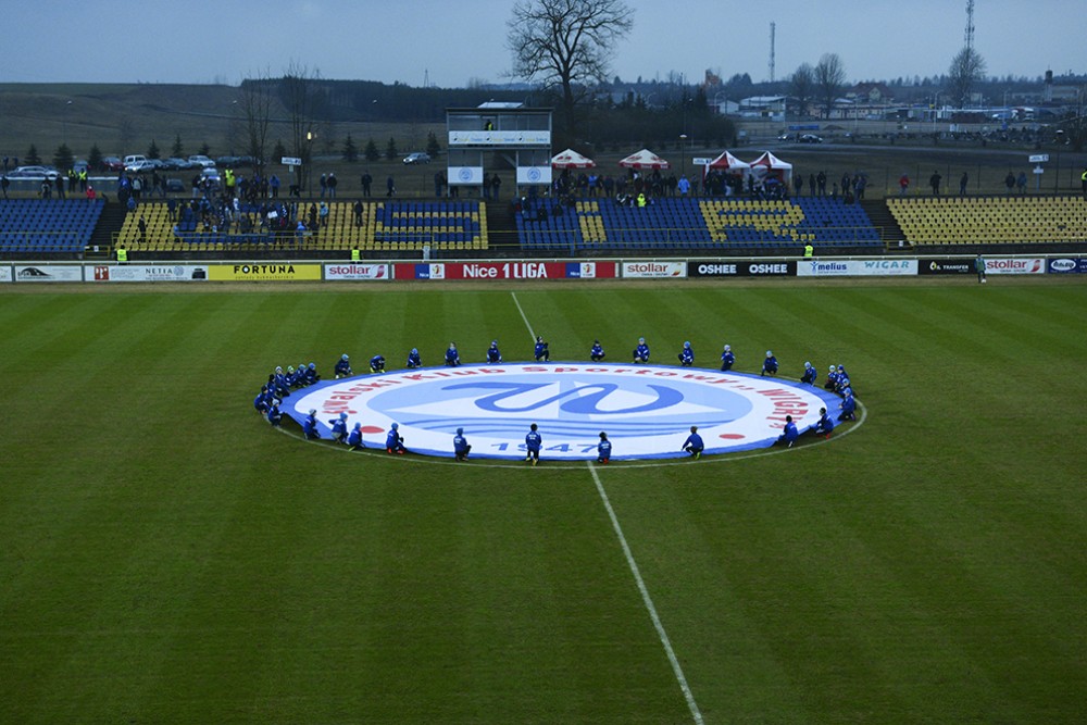 W suwalskim zespole zabrakło kontuzjowanego młodzieżowca Damiana Gąski. Szkoleniowiec Wigier nie zmienił nic w bloku defensywnym, w którym zagrał dwoma pomocnikami – Adrianem Karankiewiczem i Mateuszem Radeckim, bodaj najlepszym zawodnikiem spotkania. W przodzie wystąpili dwaj wypożyczeni z Legii 19-latkowie - Miłosz Kozak, który zajął miejsce na prawym skrzydle (Damian Kądzior przeszedł na lewą stronę) oraz Adam Ryczkowski w roli podczepionego napastnika. Tym wysuniętym był Kamil Adamek, a Kamil Zapolnik wylądował na ławce rezerwowych .