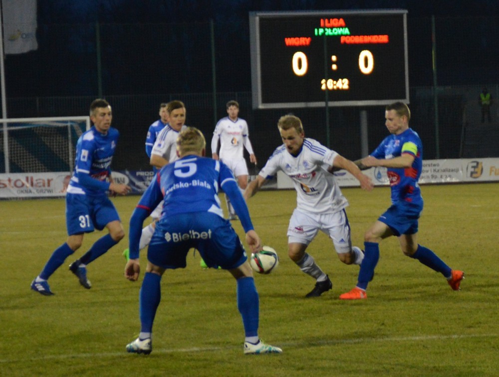 Suwalczanie zagrali jednym napastnikiem Kamilem Adamkiem (Kamil Zapolnik pauzował za kartki, a Kuku nie znalazł się w meczowej „18”). Przed przerwą niezłe okazje mieli i Adamek (w barwach Podbeskidzia debiutował w ekstraklasie, na zdjęciu walczy z Łukaszem Hanzelem, byłym pomocnikiem Wigier), który nie zdążył do podania Łukasza Wrońskiego wzdłuż bramki i Adrian Karankiewicz, i Damian Kądzior, który ładnie przyjął piłkę po zagraniu Adamka, ale został zablokowany. Goście, którzy z myśl o awansie musieli w Suwałkach wygrać, odgryźli się tylko dwoma niecelnymi uderzeniami Łukasza Sierpiny, z którym Dominik Nowak pracował kiedyś w Polkowicach. Hieronim Zoch, który w bramce zastąpił Damiana Podleśnego, był praktycznie bezrobotny. Także po zmianie stron wychwytywał tylko wrzutki i dośrodkowania.