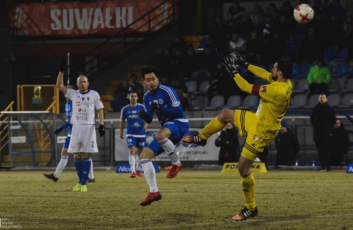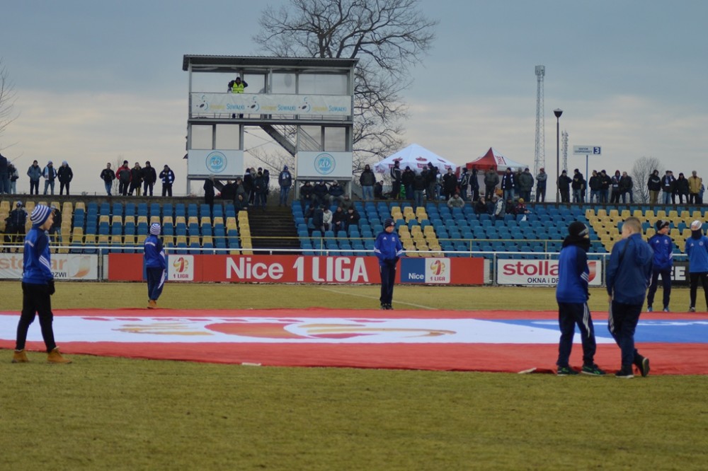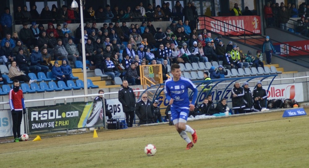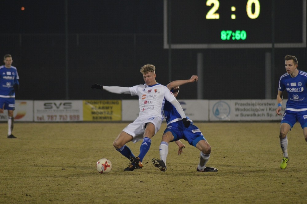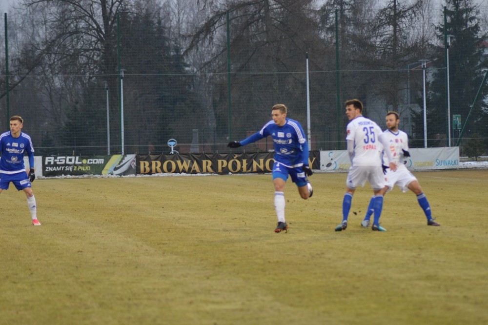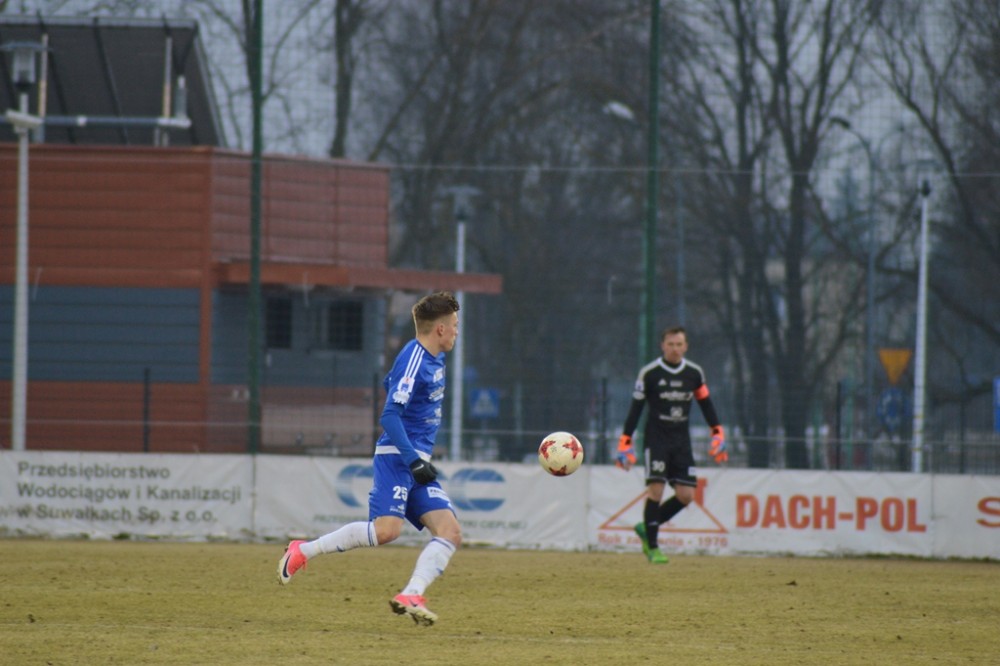 Dopiero w 23 minucie dośrodkowaniem z rzutu rożnego Damian Gąska zmusił Rafała Misztala do zbyt krótkiego odbicia piłki, ale zamykający akcję Mateusz Żyro, który debiutował przed suwalską publicznością, skiksował przy próbie strzału z powietrza. Po półgodzinie gry Damian Gąska niewiele pomylił się przy uderzeniu lewą nogą w kierunku dalszego słupka, a tuż przed przerwą celnie dośrodkował z wolnego na głowę Rafała Remisza. Stoper suwalskiej drużyny był jednak na spalonym.