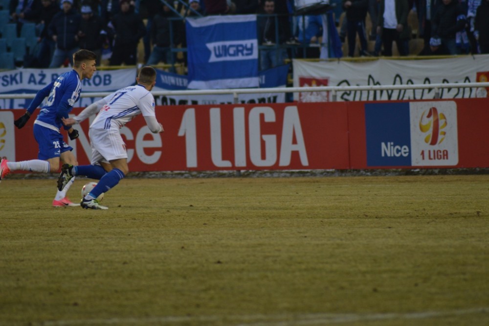 Rzeczywiście, przez pierwsze 20 minut Wigrom bardzo rzadko udawało się wyjść z własnej połowy. Starali się Patryk Klimala, który był bliski wywalczenia rzutu karnego i Damian Gąska, który uruchamiał głównie biegających lewą stroną Laurentiu Iorgę, Artura Bogusza i Mariusza Rybickiego.