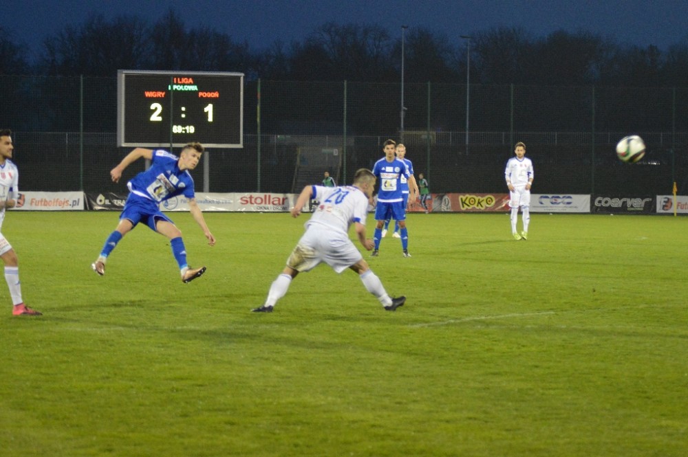 W 37. minucie to Wigrom udała się szybka kontra. Z lewej strony na bliższy słupek dośrodkował Damian Gąska, a Kamil Adamek nie do obrony strzelił głową przy samym prawym słupku. Był dziewiąty w tym sezonie gol suwalskiego snajpera, który przed dwoma tygodniami w zremisowanym 2:2 meczu z Kluczborkiem obie bramki zdobył także głową.