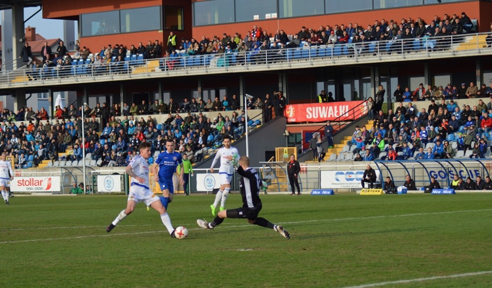 Suwalskiej bramce zagroził jeszcze Michał Mikołajczyk oraz tuż przed końcem Konrad Stępień, który niewiele się pomylił przy strzale głową w kierunku dalszego słupka. Do tej wyliczanki możemy jeszcze dodać kolejny błąd Hieronima Zocha, który raz jeszcze i znowu bezkarnie podał rywalowi piłkę we własnym polu karnym. Nic dziwnego, że kiedy bramkarz Biało-Niebieskich prawidłowo kopnął zagrana przez partnera piłkę, na trybunach słychać było głębokie westchnienie ulgi.