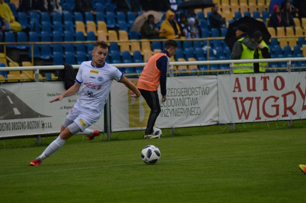 Podobnie jak w środę, Kamil Sabiłło do gola dorzucił asystę. W 44 minucie na własnej połowie przejął piłkę i zagrał do Filipa Karbowego. Były junior i gracz rezerw warszawskiej Legii popisał się piękną indywidualną akcją. Popędził z piłką od środka boiska, minął Łukasza Sołowieja, zwodem posadził na murawę Janusza Bucholca i pewnie strzelił lewą nogą obok wybiegającego Michała Leszczyńskiego. Olsztynianie dostali gola do szatni, Wigry prowadziły 2:0.
