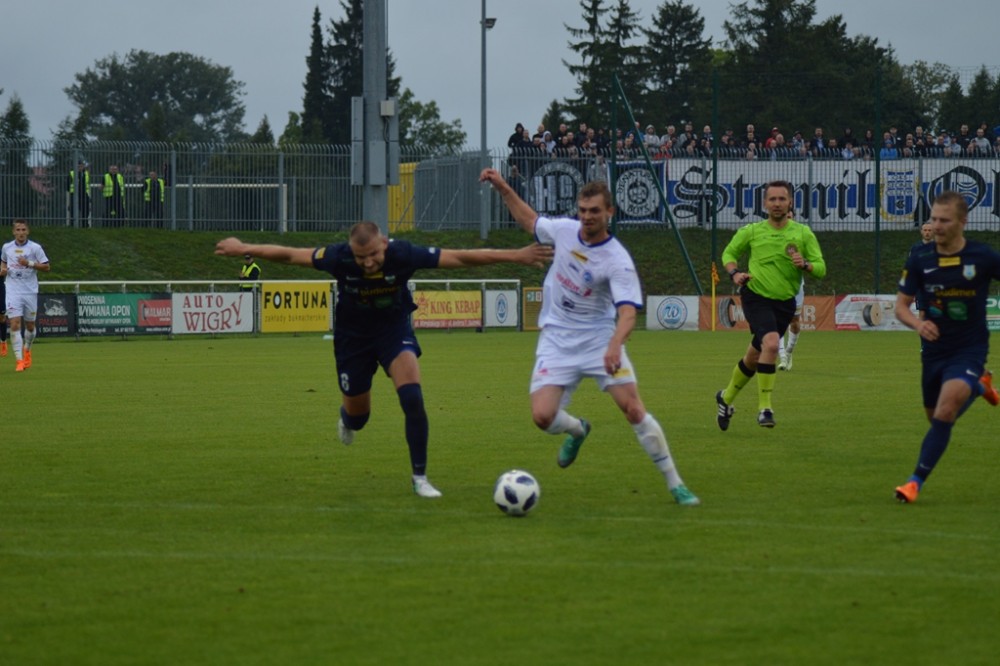 Jak na derby przystało, nie brakowało fauli, spięć i przepychanek. W jednej z nich, po faulu na obrońcy gospodarzy, uczestniczyły całe ekipy, łącznie z rezerwowymi i szkoleniowcami. W doliczonym już czasie drugą żółtą kartkę i zaraz czerwoną ujrzał Łukasz Sołowiej. Stoper Stomilu, a dawniej Wigier, taktycznym faulem zatrzymał kontratak Damiana Pawłowskiego.