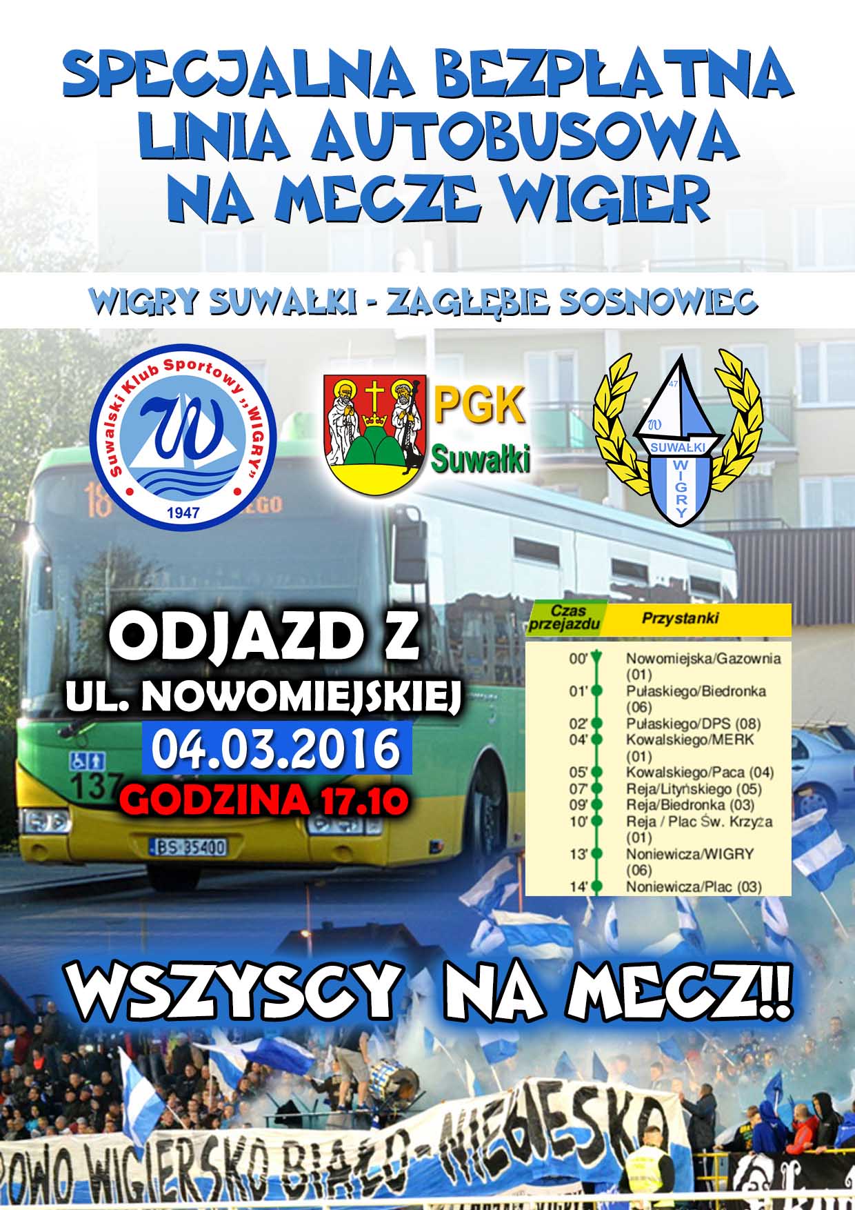To nie dosyć wygód. Suwalski klub, stowarzyszenie kibiców oraz PGK zapraszaja do skorzystania z bezpÅ‚atnego autobusu komunikacji miejskiej, który na specjalnej linii z osidla PóÅ‚noc na stadion bÄ™dzie kursowal w dniu meczów biaÅ‚o-niebieskich. W ten piÄ…tek autobus wyruszy z ulicy Nowomiejskiej o godz. 17.10.