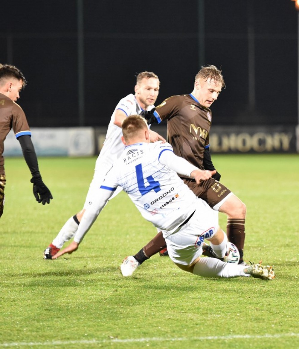 Piątkowa wygrana na pożegnanie trenera Dawida Szulczka była siódmą w tym sezonie na własnym boisku. Wigry nie dość, że zatrzymały rozpędzoną Garbarnię, to przedłużyły swoja serię meczów bez porażki do pięciu. Jedynego gola, po kiksie defensora krakowian, zdobył Denis Gojko (na górnym zdjęciu przy piłce).