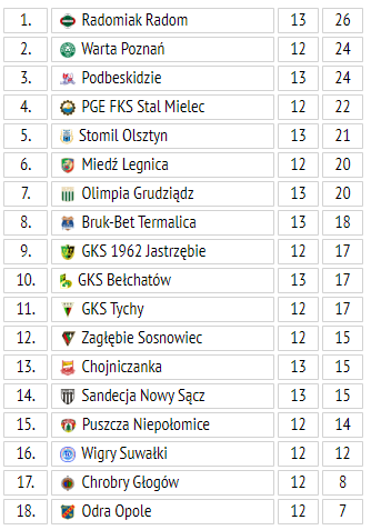 Przez powołania do młodzieżowych i juniorskich reprezentacji rozegrane zostały tylko cztery mecze 13. kolejki. Remisami zakończyły się piątkowe spotkania Stomilu Olsztyn z Bruk-Bet Termalica Nieciecza i Chojnicznkai Chojnice. W sobotę serię sześciu zwycięstw z rzędu przerwał Radomiak Radom. Lider na własnym boisku został poskromiony przez Podbeskidzie Bielsko-Biała. W spotkaniu beniaminków w Bełchatowie, GKS wygrał z Olimpią Grudziądz.