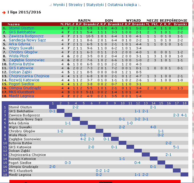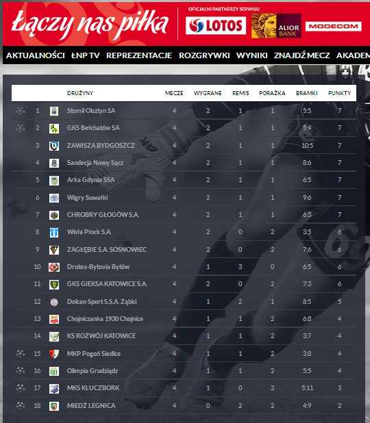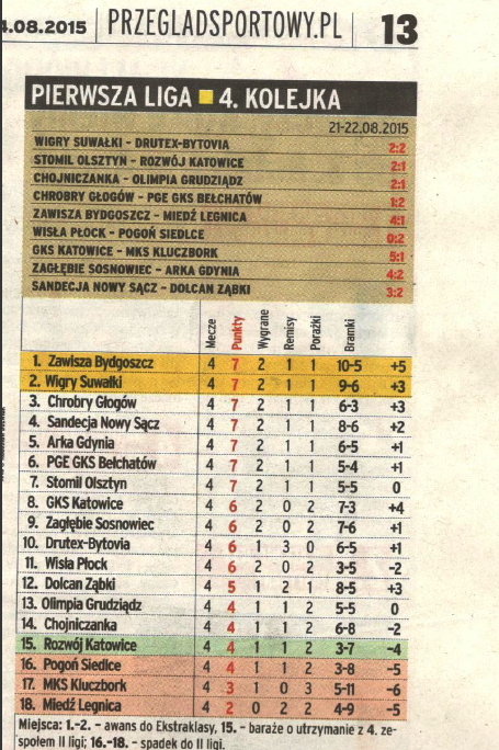 Kibice suwalskich Wigier przeglądając tabele I ligi własnym oczom nie wierzą i pytają, na którym naprawdę miejscu są nasi piłkarze: drugim, jak podają Przegląd Sportowy i telegazeta TVP1, czy szóstym, co widać na stronach 90minut.pl i laczynaspilka.pl? Podobna sytuacja jest z Zawiszą Bydgoszcz, który po dwa razy jest liderem i zajmuje 3. miejsce. Jedno jest pewne, tabelę zamyka Miedź Legnica, która od dziś ma nowego trenera, bowiem po kolejnej porażce Ryszarda Kuźmę zastąpił Ryszard Tarasiewicz.