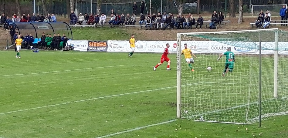 Wspomniana przez prezesa „setkę” zmarnował Paweł Kaczmarczyk, który jednak zaraz pięknym strzałem z wolnego zdobyły jedynego gola i to on był motorem napędowym szybkich kontr. Po dośrodkowaniu z rożnego piłka trafiła do Adriana Karankiewicza, który zwiódł jeszcze obrońcę, ale huknął w słupek. Podobnego pecha miał Dawid Polkowski.