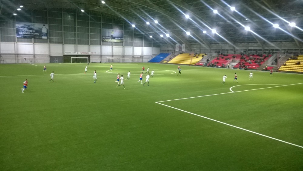 Jedynego gola meczu, tuż przed przerwą zdobył znany z występów w Polonii Warszawa Vytautas Lukśa. Wykorzystał dośrodkowanie z rzutu rożnego i gapiostwo suwalskich obrońców i kapitalnym strzałem z woleja tuż przy prawym słupku nie dał szans testowanemu w Wigrach Krzysztofowi Karpieszukowi, 20-letniemu bramkarzowi rezerw Jagiellonii Białystok. Więcej stuprocentowych sytuacji litewski zespół, prowadzany przez byłego gracza białostockiego klubu Andriusa Skerlę, nie stworzył.