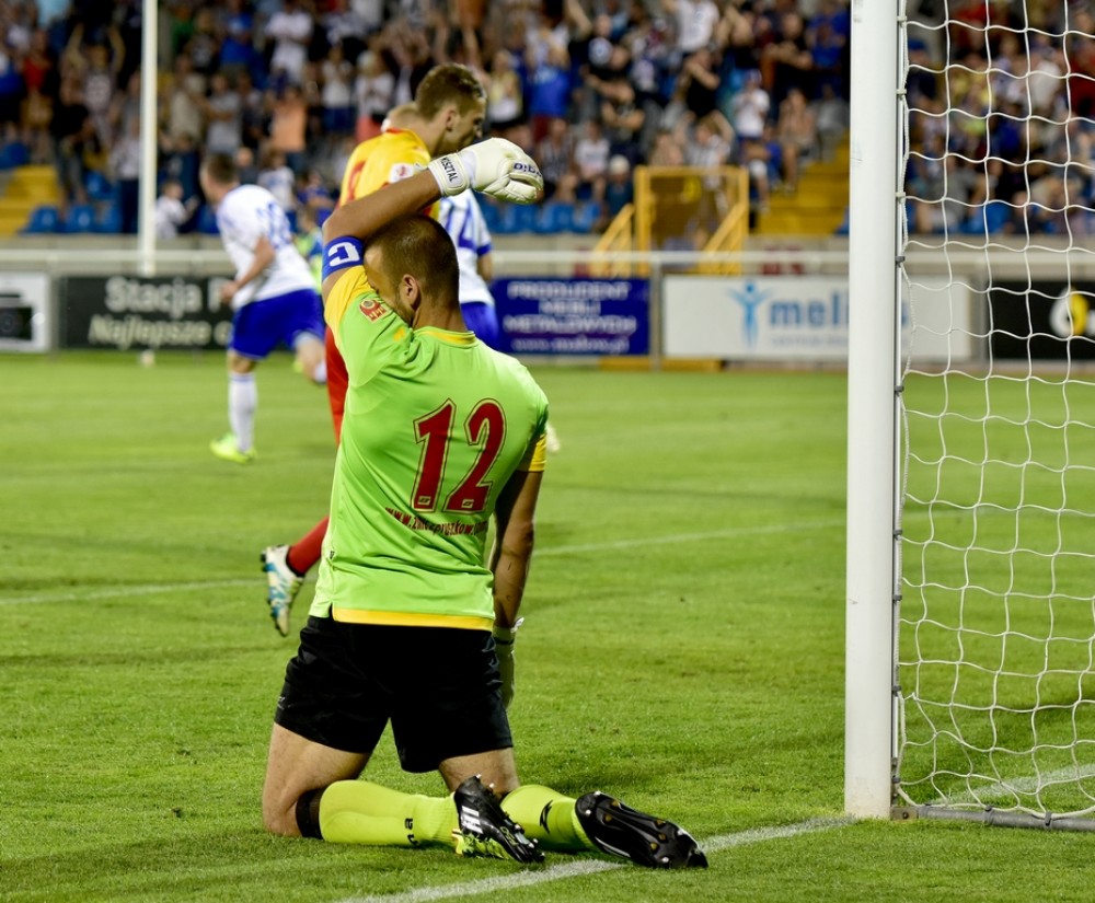 Ciężką przeprawę z ówczesnym beniaminkiem Nice 1 Ligi Biało-Niebiescy mieli też u siebie. Aż do 88 minuty przegrywali 0:1. Wyrównał Kamil Adamek (na górnym zdjęciu), a w 90 minucie na 2:1 strzelił Kamil Zapolnik. Pod bramkarzem gości Piotrem Misztalem (poniżej) ugięły się nogi). Przyjezdni nie mogli uwierzyć, że nie zdobyli na Zarzeczu nawet punktu.