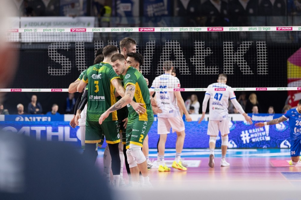 Na poczÄ…tek wicemistrz Polski i wicelider tabeli Aluron CMC Warta Zawiercie, która okrutnie zlaÅ‚a naszych w pierwszej rundzie w SuwaÅ‚ki Arenie. Bartosz Kwolek, Karol Butryn, Mateusz Bieniek, Aaron Russell i spóÅ‚ka dziÄ™ki bardzo dobrej zagrywce szybko wygrali ze Åšlepskiem w setach do 11,18 i 21 (na zdjÄ™ciu).