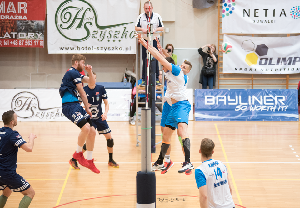 Cezary Sapiński (na fot. w granatowej koszulce z nr. 14), który w sezonie 2016/17 grał w SKS Hajnówka, dołączył do ekipy wicemistrza I ligi Ślepska Suwałki. To trzeci obok Adriana Hunka i Łukasza Rudzewicza zawodnik grający na pozycji środkowego bloku.