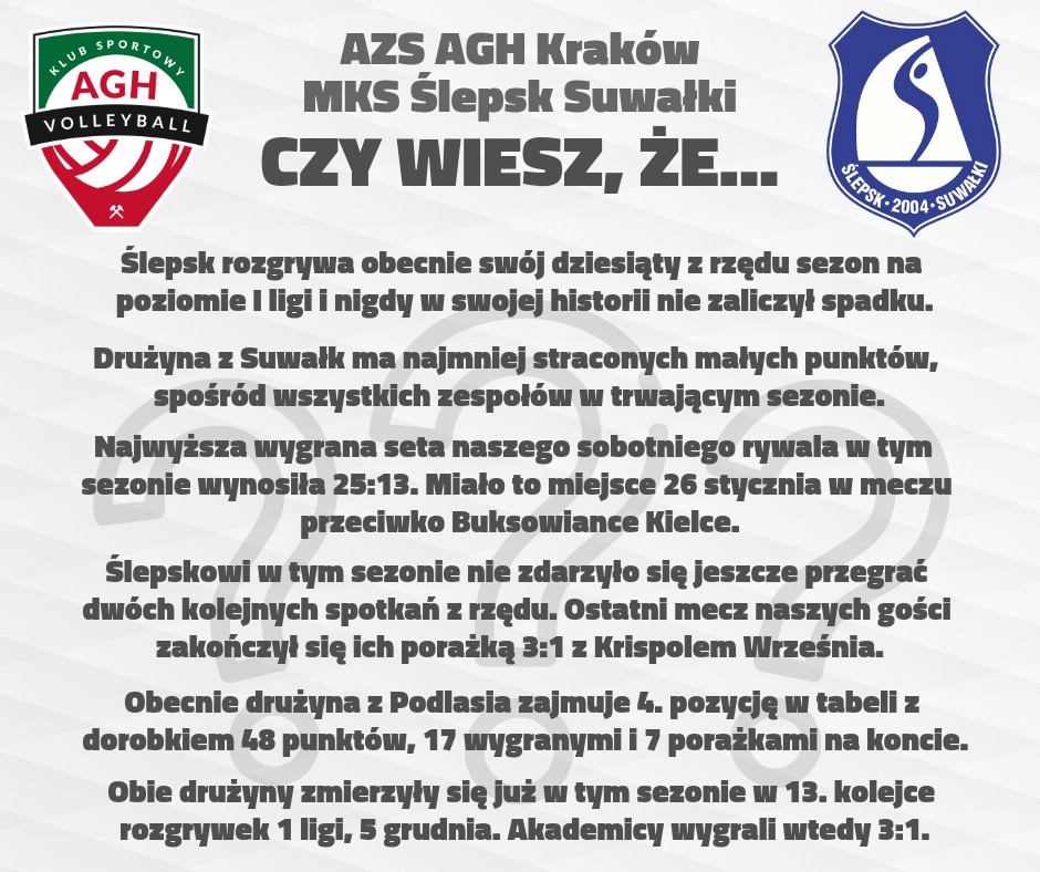 Warto zwrócić uwagę na statystyki bezpośrednich spotkań AGH – Ślepsk w sezonie 2017/18 i 18/19. Z 8. rozegranych spotkań (runda zasadnicza + play-off) Ślepsk wygrał zaledwie ... 3 (słownie: TRZY), w tym dwa w Krakowie. W pierwszej rundzie w Suwałkach akademicy wygrali 3:1 (25:19, 23:25, 25:20, 25:27), a MVP meczu został atakujący akademików Bartłomiej Gajdek.