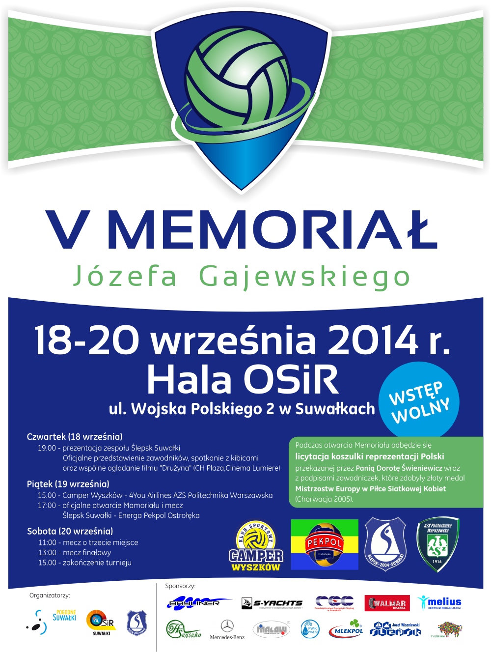 Do inauguracji rozgrywek I ligi siatkarzy pozostało 11 dni (27.09. z Victorią Wałbrzych), ale już w czwartek kibice będą mogli poznać całą drużynę Ślepska Suwałki. Prezentacja drużyny, połączona z premierą w Suwałkach filmu "Drużyna", rozpocznie się 18.09. o godz. 19.00 w CH Plaza - sala Cinema Lumiere. Natomiast w piątek i sobotę w hali OSiR rozegrany zostanie V Memoriał Józefa Gajewskiego, w którym, obok Ślepska, wystąpią Camper Wyszków, Energa Pekpol Ostrołęka i PlusLigowy 4You Airlines AZS Politechnika Warszawska.