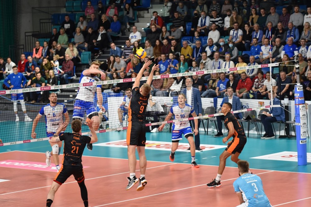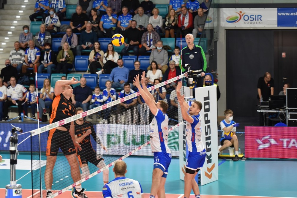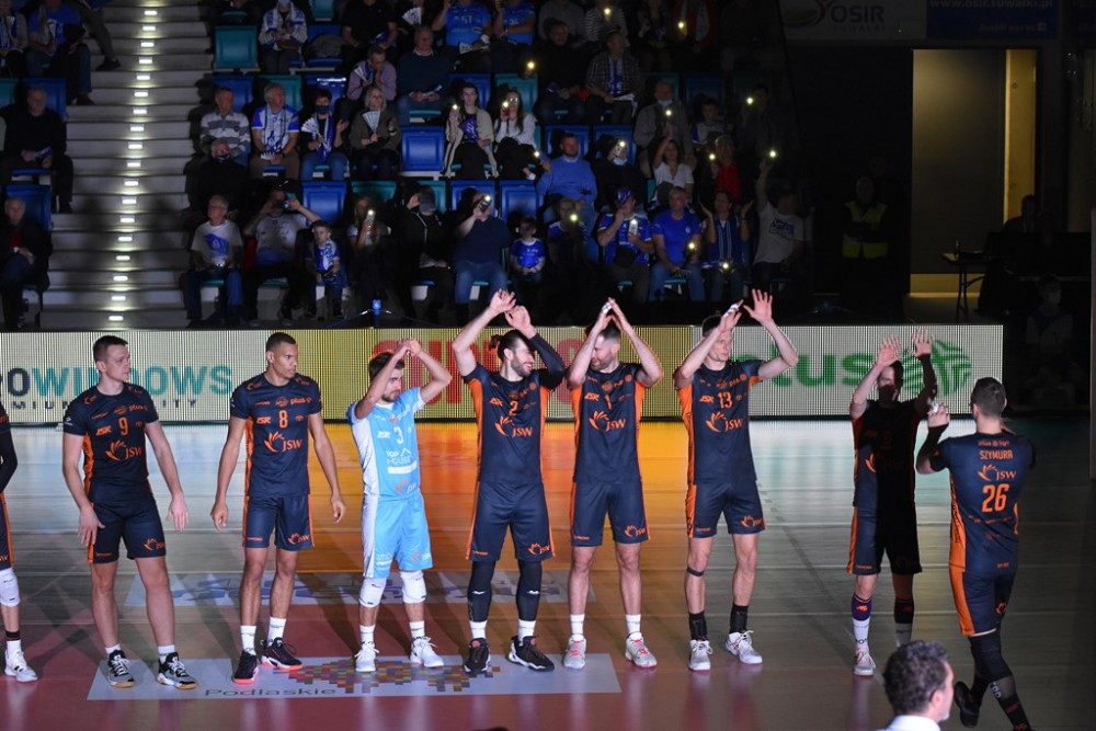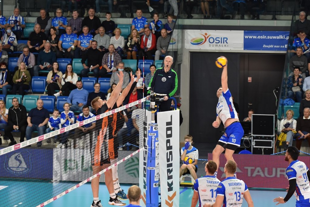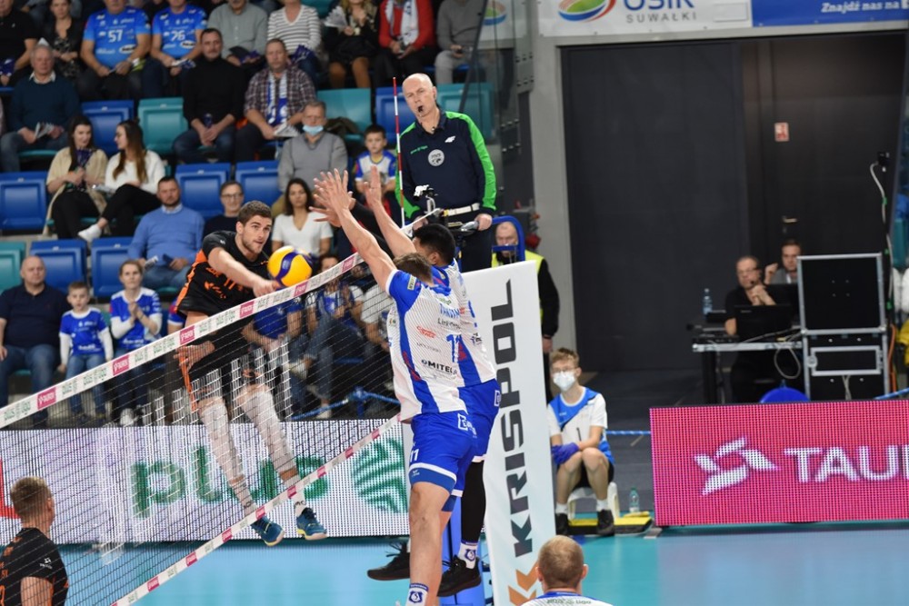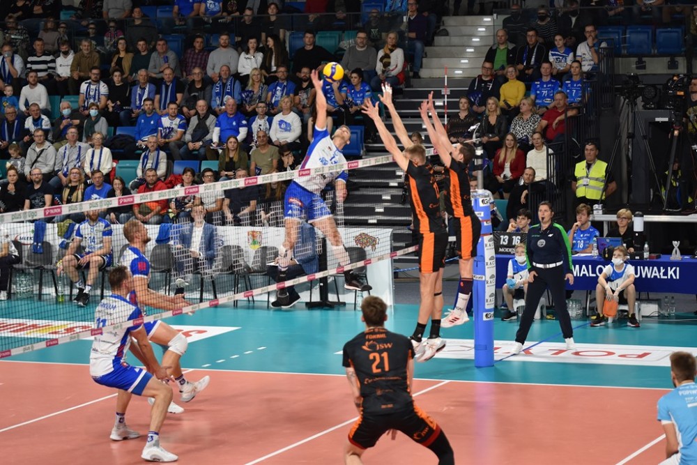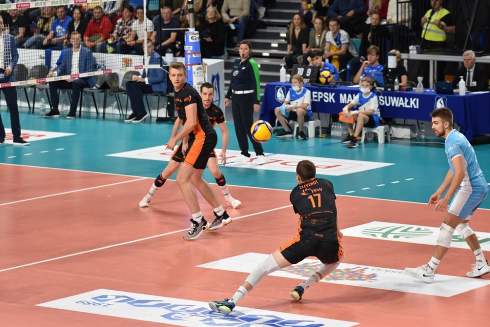 Przy lżejszych zagrywkach zawodników suwalskiej drużyny i dobrym odbiorze swoich kolegów, sprowadzony tego lata do Jastrzębia z ZAKSY francuski rozgrywający Benjamin Toniutti dogrywał na skrzydła do swoich kolegów, z którym w Tokio sięgnął po mistrzostwo olimpijskie. Przy dobrej, mylącej suwalski blok wystawie, Stephen Boyer z prawego i wybrany MVP spotkania Trevor Clevenot z lewego skrzydła atakowali ponad albo obijali ręce naszych zawodników. Kiedy zaś gracze Jatrzębskiego przyjmowali idealnie, piłka błyskawicznie leciała do Jurija Gładyra bądż Łukasza Wiśniewskiego, którzy ze środka wbijali gwoździe w parkiet Suwałki Areny.