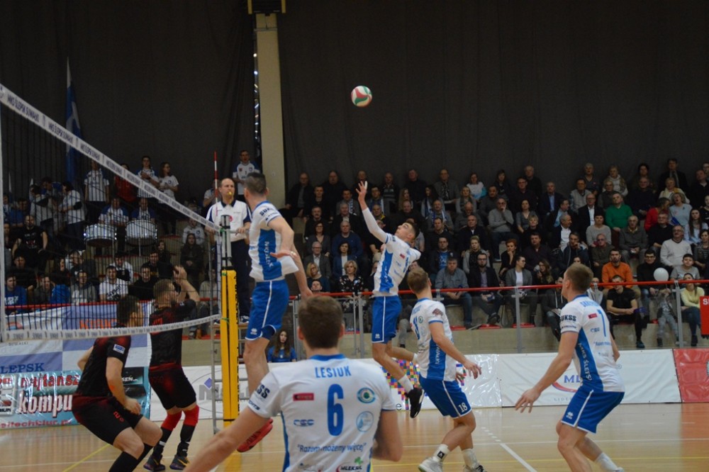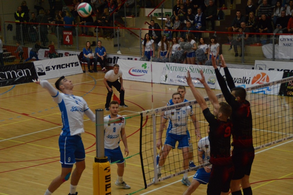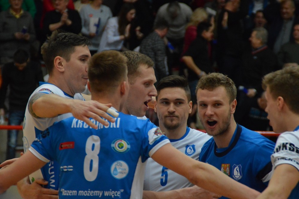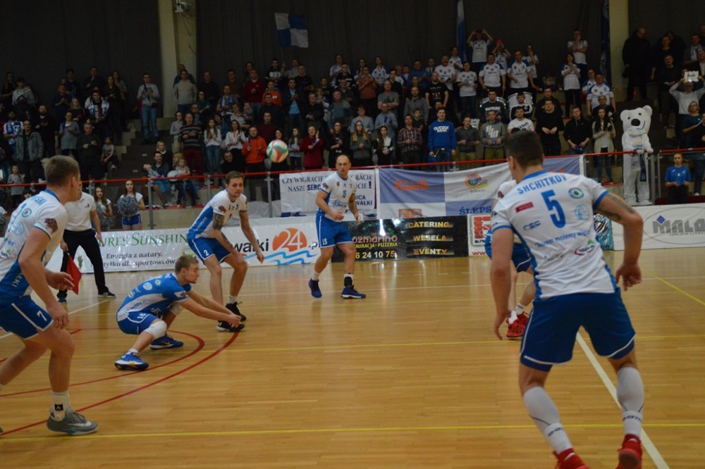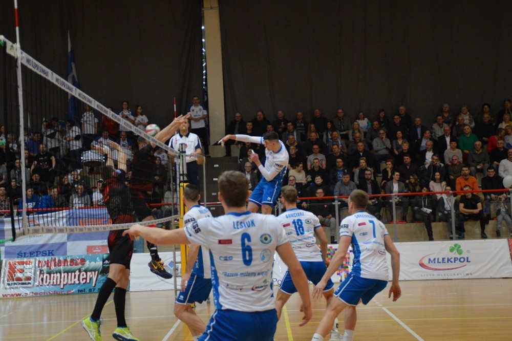 Pierwsze po półtoramiesięcznej przerwie spotkanie przed własną publicznością Biało-Niebiescy zaczęli nerwowo. Od początku przegrywali, ale od stanu 3:4 rozgrywający Kacper Gonciarz coraz częściej wyprowadzał w pole przyjezdnych. Na prawym skrzydle piorunującymi ścięciami popisywał się Kewin Sasak, którego występ w tej części, wzorem sypiącego rymowankami jak z rękawa spikera meczu, można by określić „Kewin Sasak – kończy każdy atak”. Na zagrywkę udanie wchodzili Witalij Szczytkow i Cezary Sapiński. Po lewej stronie boiska gorsi nie chcieli być Jan Lesiuk i Kamil Skrzypkowski, kilka punktów dołożyli środkiem Adrian Hunek oraz imponujący staranną fryzurą i bródką Łukasz Rudzewicz, i pierwszą odsłonę Ślepsk wygrał 25:21.