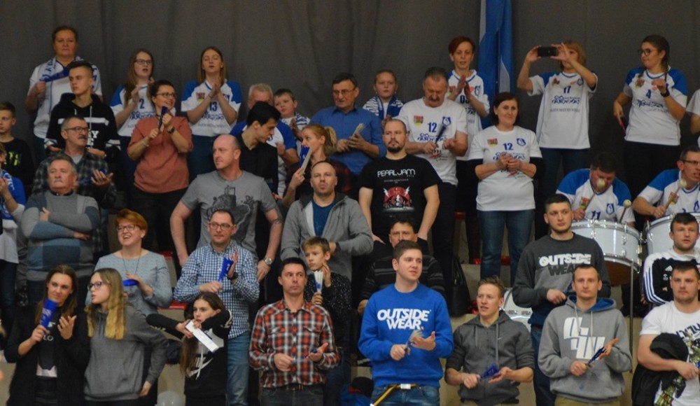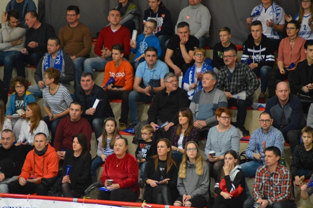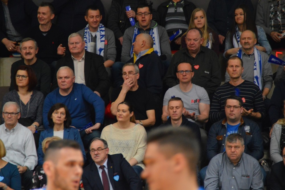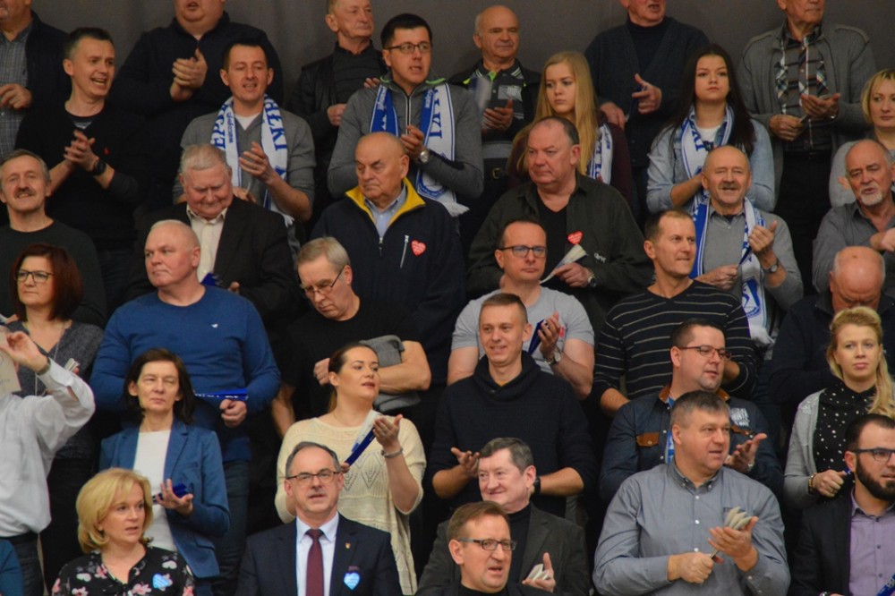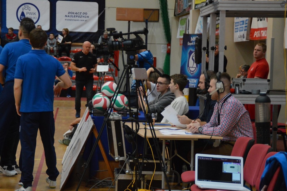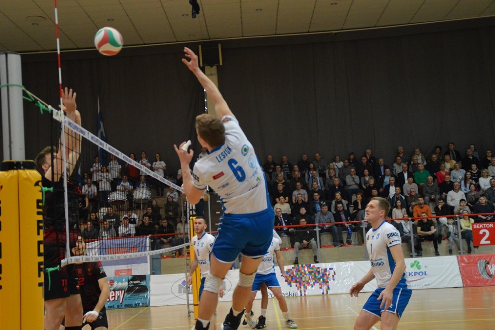 Pierwsze po półtoramiesięcznej przerwie spotkanie przed własną publicznością Biało-Niebiescy zaczęli nerwowo. Od początku przegrywali, ale od stanu 3:4 rozgrywający Kacper Gonciarz coraz częściej wyprowadzał w pole przyjezdnych. Na prawym skrzydle piorunującymi ścięciami popisywał się Kewin Sasak, którego występ w tej części, wzorem sypiącego rymowankami jak z rękawa spikera meczu, można by określić „Kewin Sasak – kończy każdy atak”. Na zagrywkę udanie wchodzili Witalij Szczytkow i Cezary Sapiński. Po lewej stronie boiska gorsi nie chcieli być Jan Lesiuk i Kamil Skrzypkowski, kilka punktów dołożyli środkiem Adrian Hunek oraz imponujący staranną fryzurą i bródką Łukasz Rudzewicz, i pierwszą odsłonę Ślepsk wygrał 25:21.