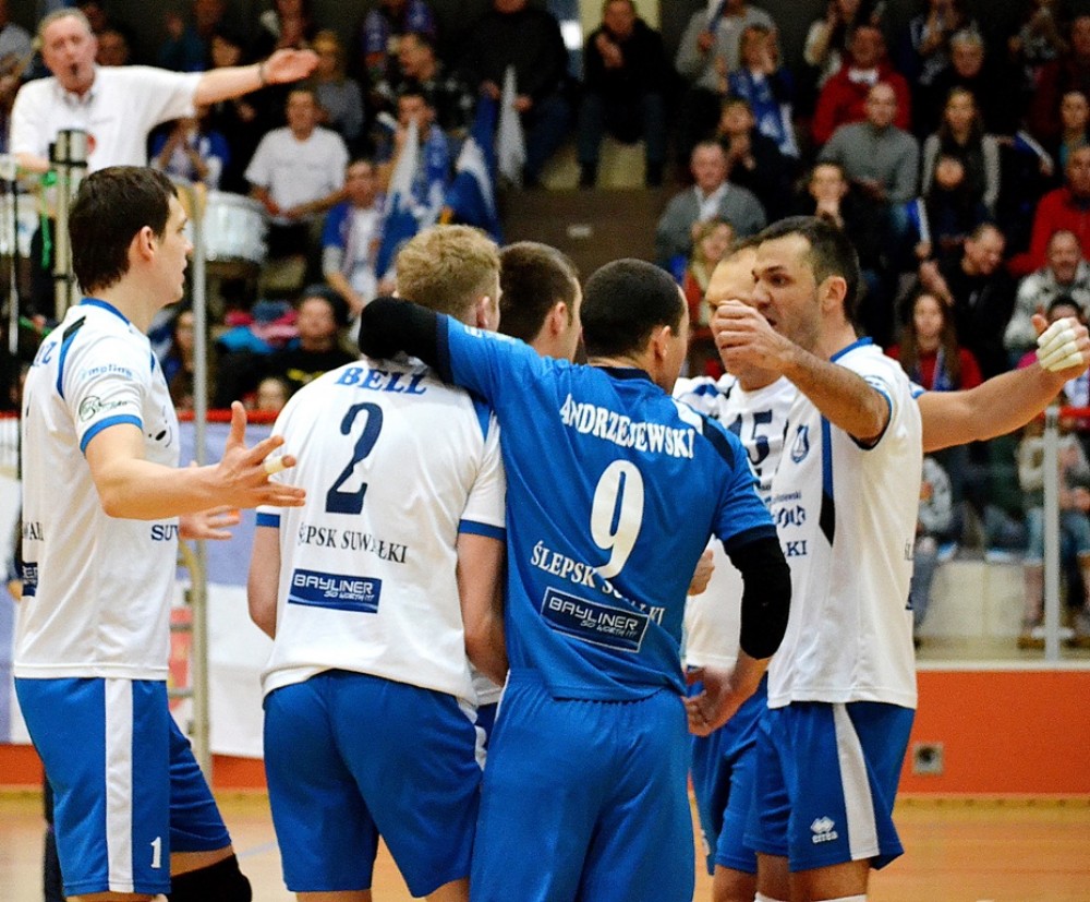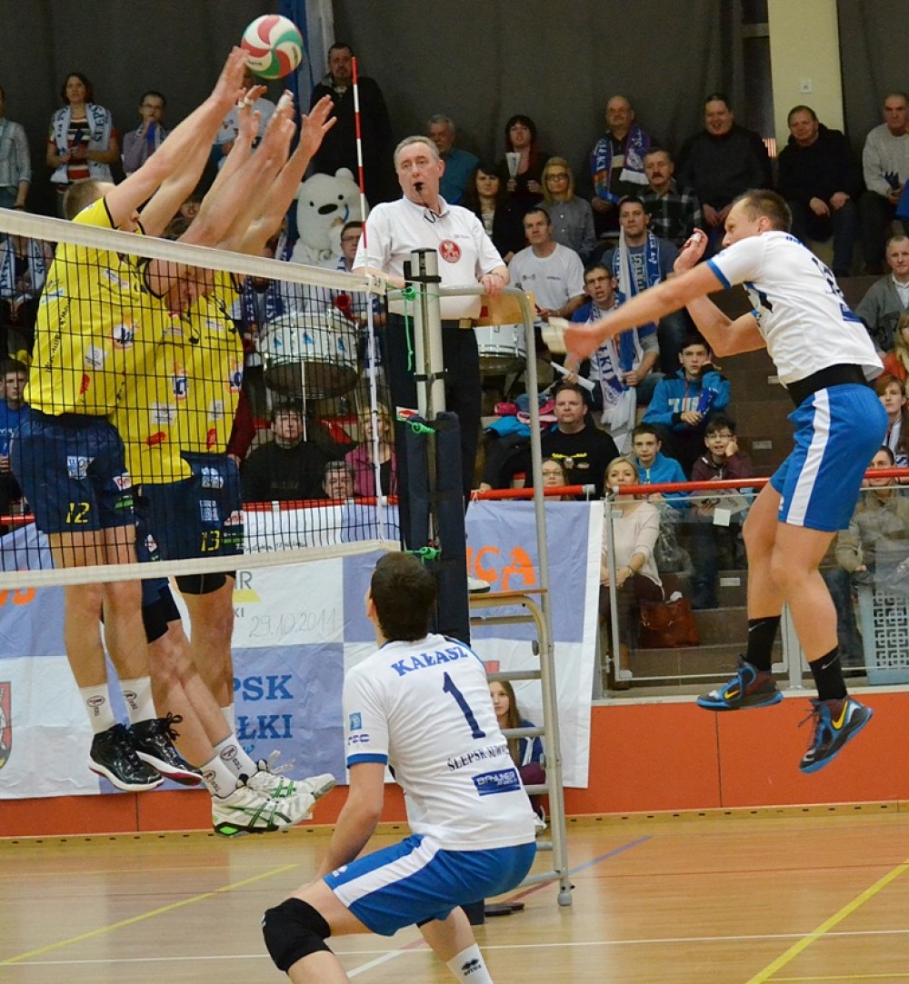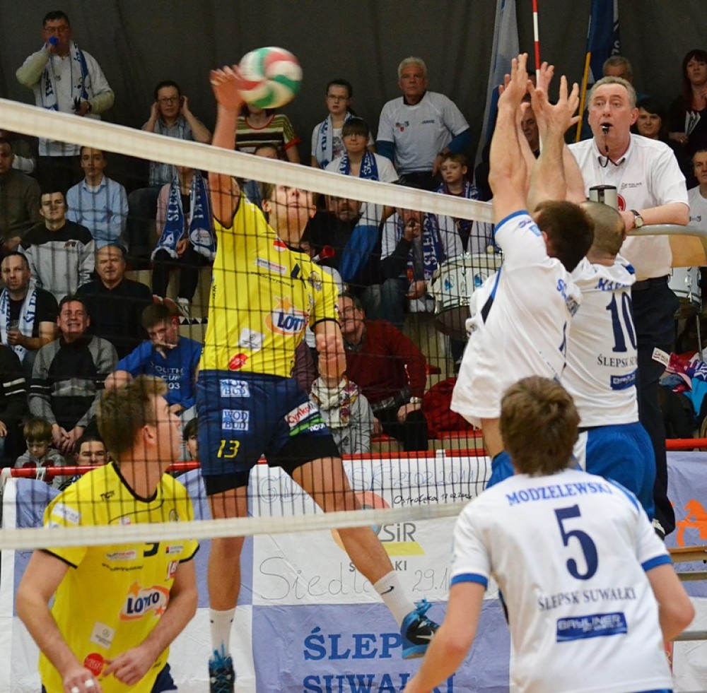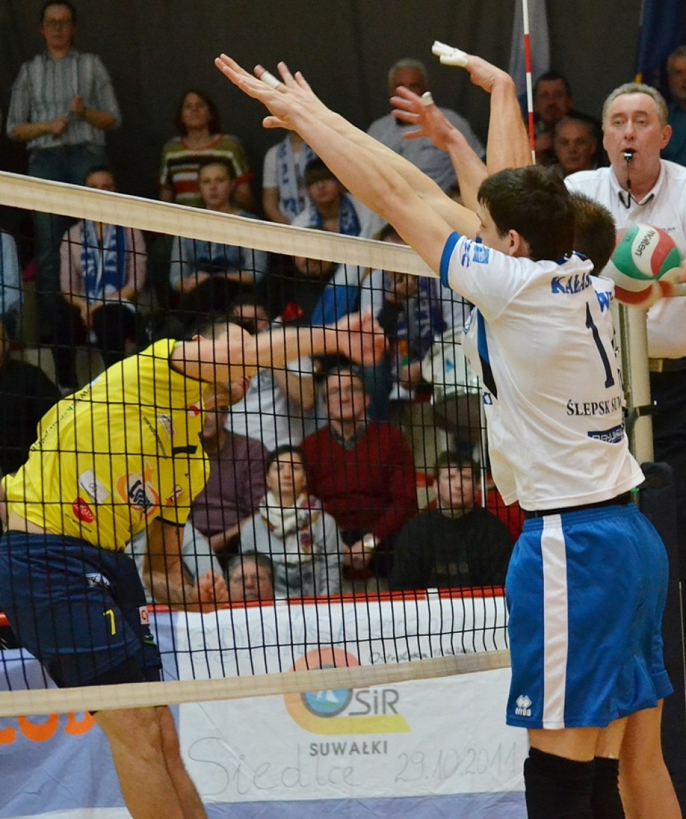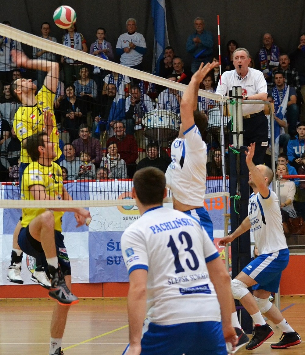 Po ataku Sebastiana Wójcika goście wyszli na dwupunktowe prowadzenie, jednak gdy w ataku pomylił się Dariusz Szulik to miejscowi mieli o punkt więcej od wyszkowian (3:2). Zespół Jana Sucha grał bardzo nerwowo i gdy Maciej Kałasz wyprowadził Ślepsk na 5:3 o czas poprosił trener Such. Po chwili szkoleniowiec zespołu z Mazowsza ponownie poprosił podopiecznych do siebie, a suwałczanie po asie Kamila Skrzypkowskiego prowadzili 7:3. Gdy oba zespoły szły na pierwszą przerwę techniczną gospodarze prowadzili tylko dwoma oczkami. Choć ekipa z Suwałk po kontrze Skrzypkowskiego odskoczyła jeszcze na 12:8, to po chwili był remis 12:12. Drużyna Piotra Poskrobko popełniała sporo błędów, co z zimną krwią wykorzystywane było przez przyjezdnych. Kiedy w ataku pomylił się Wojciech Winnik Camper wyszedł na prowadzenie 14:12, a gdy punkt ze środka dołożył Szulik w Suwałkach było już 17:13 dla zespołu gości. Suwałczanie zdołali odrobić straty i po kontrze Mariusza Schamlewskiego był remis 20:20. Od tego momentu obie ekipy szły punkt za punkt. Prowadzenie przechodziło z jednej strony na drugą, jednak zarówno ani Ślepsk, ani Camper nie potrafili postawić kropki nad „i". Dopiero przy stanie 31:31 ze skrzydła zaatakował Winnik, a gdy gospodarze zablokowali Łukasza Kaczorowskiego miejscowi prowadzili w meczu 1:0. W drugiej odsłonie meczu mimo że Kałasz blokiem zatrzymał Kaczorowskiego (1:0) inicjatywa leżała po stronie gości. Podopieczni Jana Sucha do pierwszej przerwy technicznej utrzymywali jednopunktową przewagę, jednak po akcjach Schamlewskiego i Łukasza Makowskiego było 8:7 dla gospodarzy. Wyszkowianie wyrównali jeszcze na 11:11, ale gdy punkt zagrywki dołożył Dmitrij Skoryy na tablicy wyników było 16:13 dla Ślepska. W tym momencie suwałczanie stanęli jak zaczarowani, a pięć wygranych wygranych przez Campera sprawiło, że wyszkowianie mieli dwa punkty przewagi nad rywalem (18:16), których nie oddali do końca seta. Po błędach siatkarzy Jana Sucha Ślepsk zbliżył się na 21:22, jednak gdy piłkę poza boisko posłał Winnik w meczu był remis 1:1.