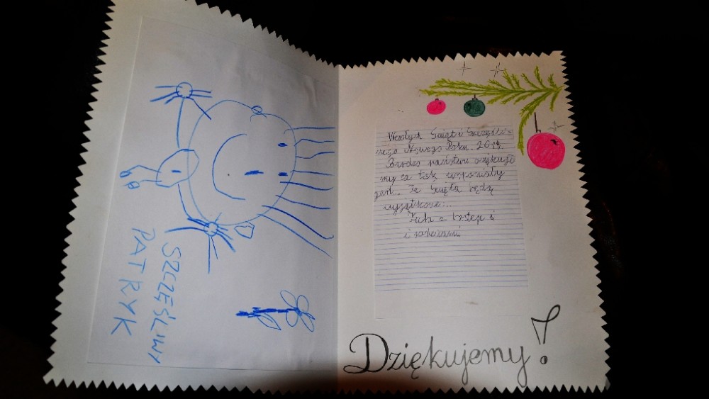 W podziękowaniu za otrzymaną paczkę zawodnicy dostali przepiękną kartkę z życzeniami wykonaną przez chłopców oraz usłyszeli nietypowe życzenia z ust małego chłopca .. "abyście zawsze mieli siłę i zdrowie i wszystko wygrywali".