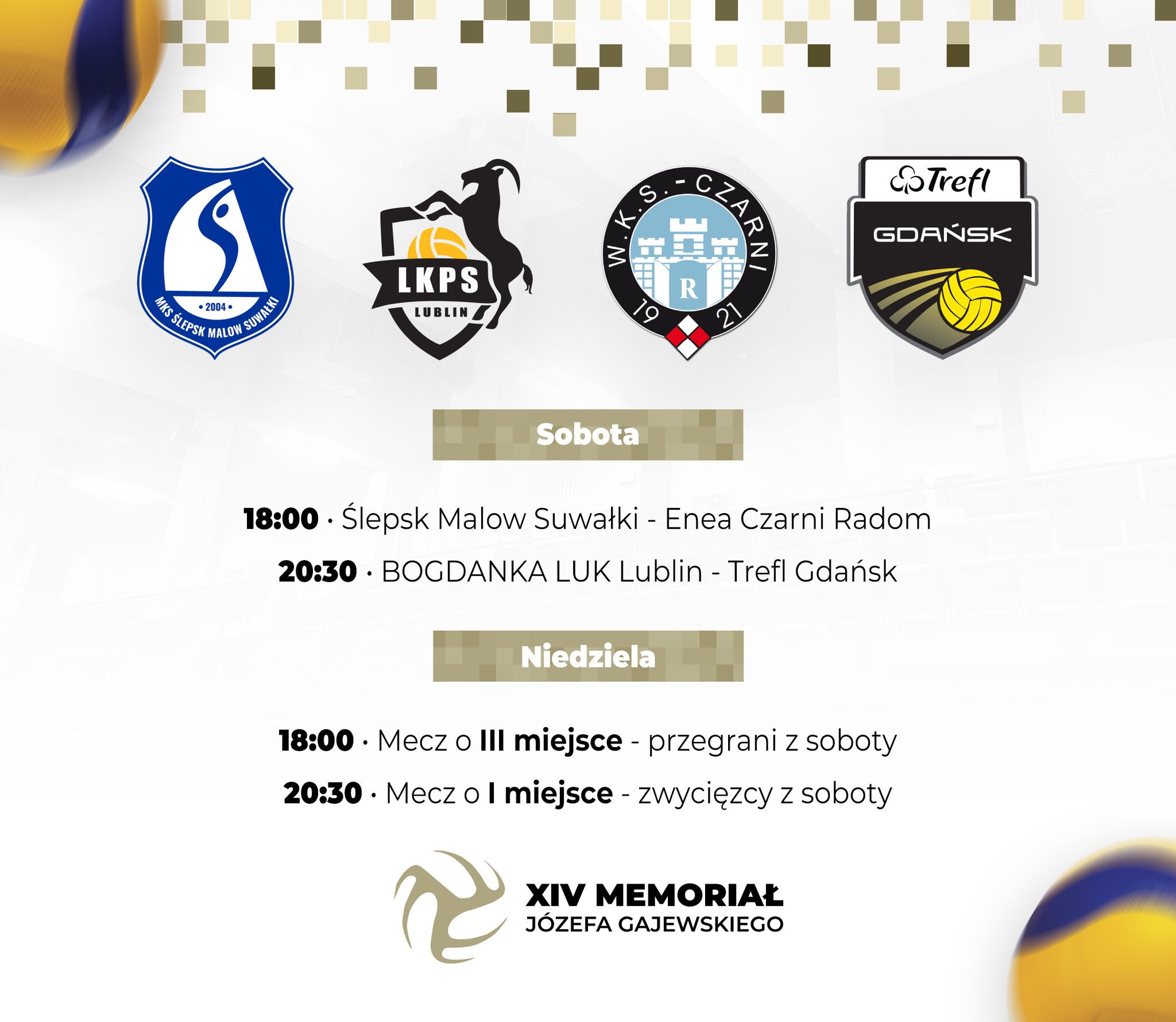 Oba wymienione zespoÅ‚y, a także Trefl GdaÅ„sk i Enea Czarni Radom wystÄ…piÄ… w tÄ™ sobotÄ™ i niedzielÄ™ (poczÄ…tek spotkaÅ„ o godz. 18:00 i 20:30) w 14. Memoriale Józefa Gajewskiego. Turniej bÄ™dzie jednym z ostatnich już sprawdzianów przed ruszajÄ…cym 21 października sezonem PlusLigi.