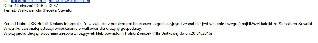 Dzisiaj w południe działacze UKS Hutnik Kraków e-mailem poinformowali Ślepsk Suwałki i Polski Związek Piłki Siatkowej, że ich drużyna nie przyjedzie w sobotę do Suwałk na mecz 15. kolejki i wnioskują o przyznanie Ślepskowi punktów walkowerem.