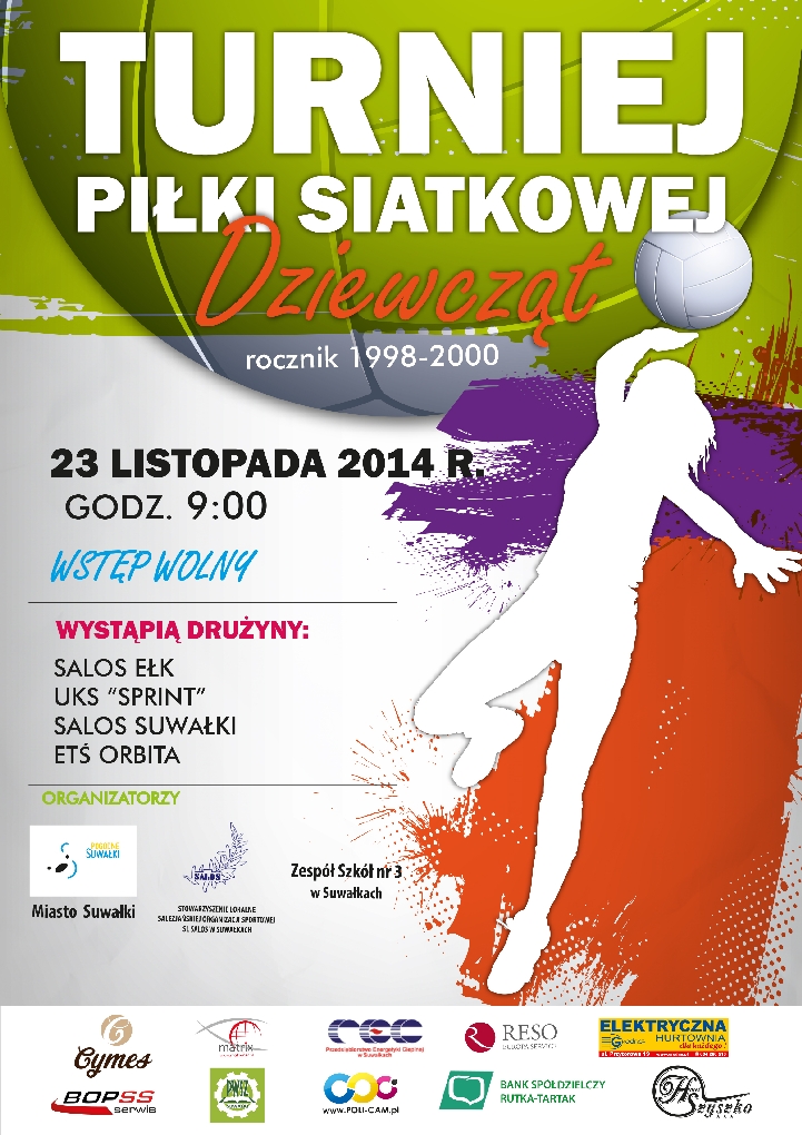 W niedzielę (23.11.) na hali sportowo-widowiskowej ZS nr 3 w Suwałkach odbędzie się Jesienny Turniej Piłki Siatkowej Dziewcząt. W zawodach wystartują zawodniczki z rocznika 1998-2000 z: SALOS Ełk, UKS SPRINT Płociczno-Tartak, SALOS Suwałki i ETŚ Orbita.