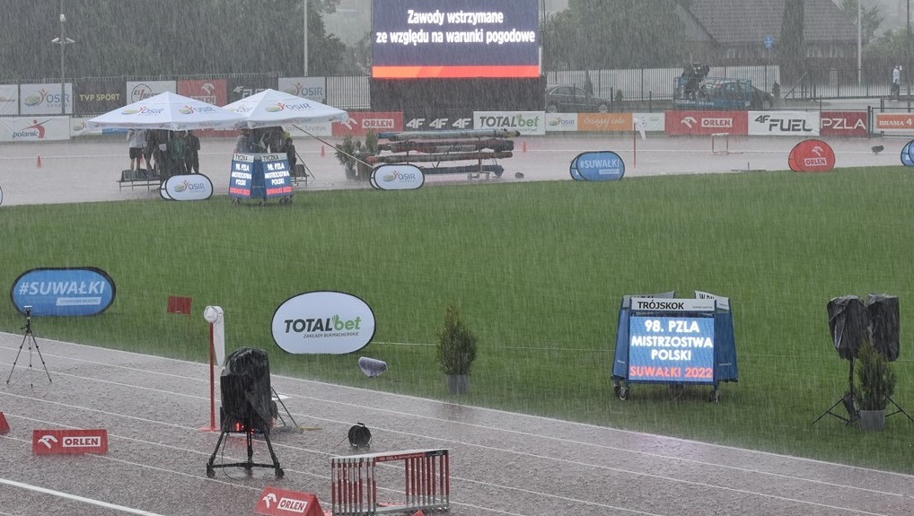- Pierwszy dzieÅ„ 98. PZLA Mistrzostw Polski SuwaÅ‚ki 2022 zostaÅ‚ odwoÅ‚any z uwagi na intensywne opady deszczu, gradu i burzÄ™. Nowy program minutowy zostanie ogÅ‚oszony w godzinach wieczornych. O szczegóÅ‚ach poinformujemy PaÅ„stwa w osobnym komunikacie - powiadomili organizatorzy.