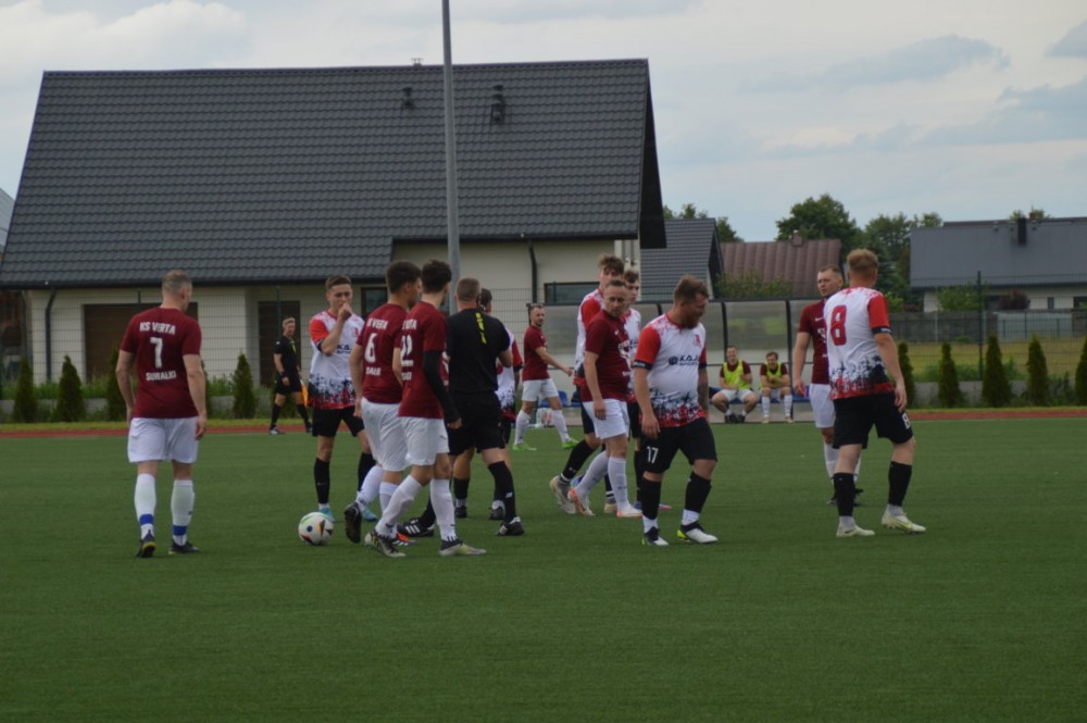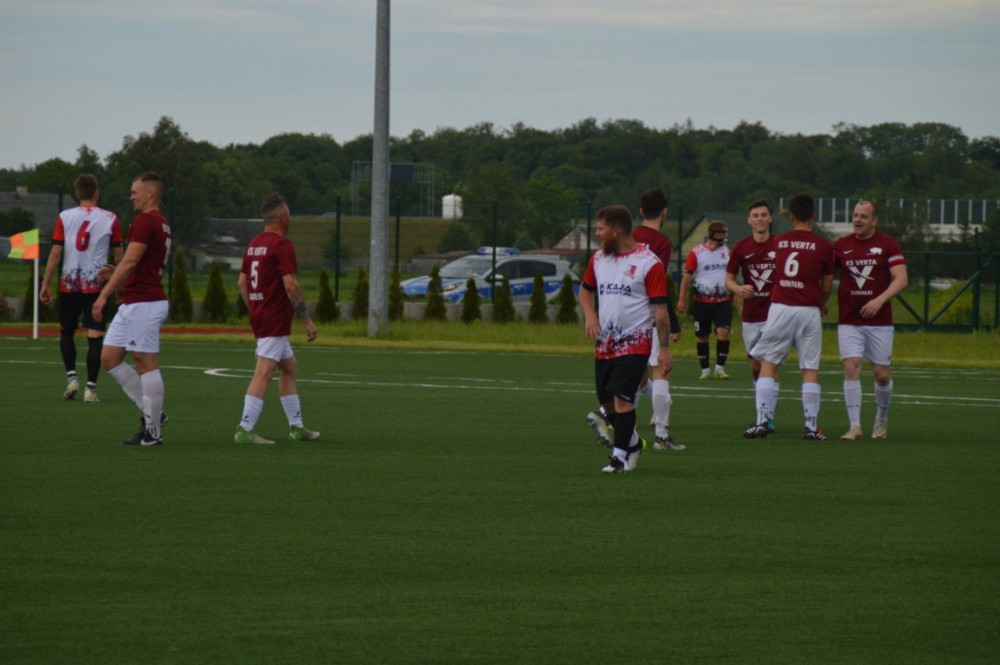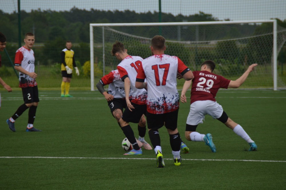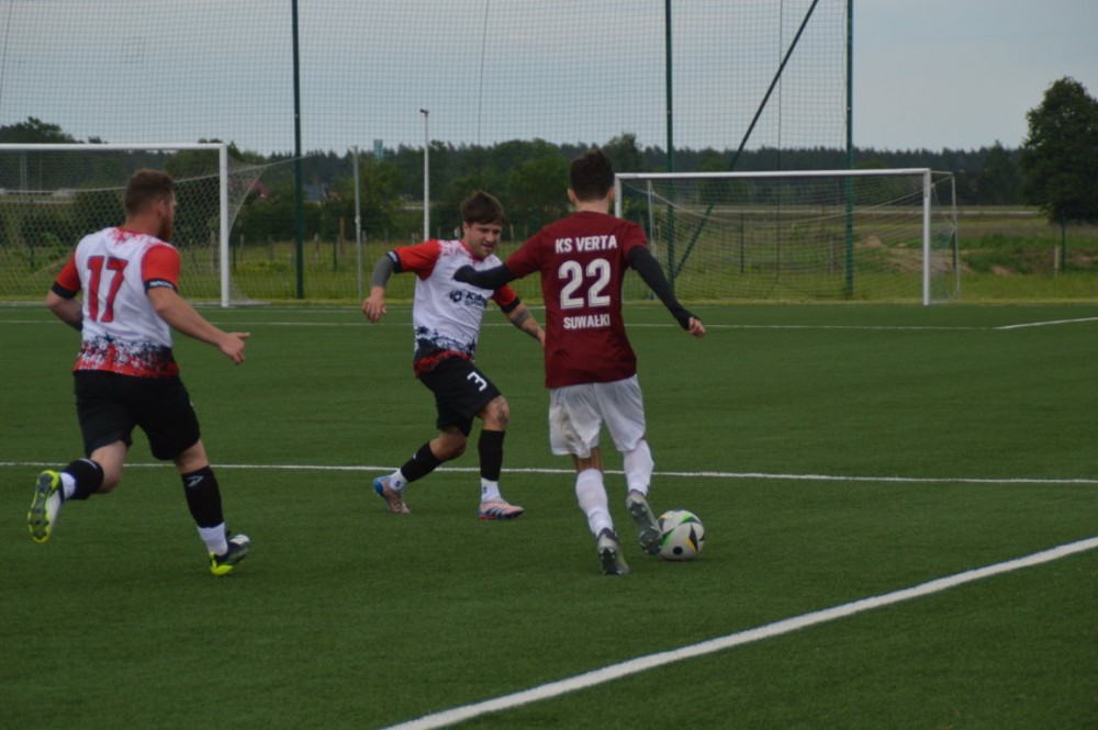 W sobotę grała także trzecia w tabeli Polonia Raczki, która po dwóch bramkach Mateusza Buczyckiego i jednej Sebastiana Jankowskiego wygrała 3:2 derbowy mecz z Vertą Suwałki (na zdjęciach)