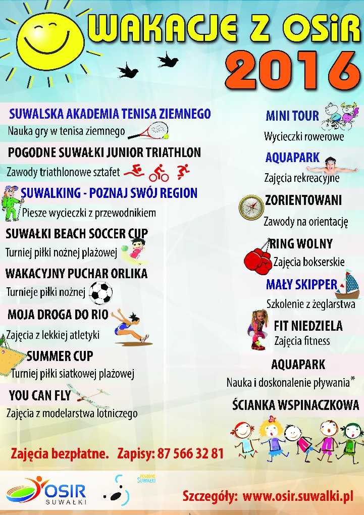 Biegi na orientację, żeglarstwo, turnieje plażowej piłki nożnej i siatkowej, tenis ziemny i pływanie, boks i wspinaczka na ściankach, triathlon, zwiedzanie Suwalszczyzny na rowerach i pieszo, fitness i zumba to niektóre propozycje z bogatego programu przygotowanego przez suwalski Ośrodek Sportu i Rekreacji na wakacje 2016. Każdy, kto będzie chciał spędzić je aktywnie i zdrowo, znajdzie coś dla siebie.