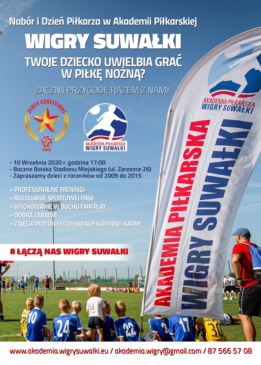 Znasz dziecko, którego pasjÄ… jest piÅ‚ka nożna? Akademia PiÅ‚karska Wigry SuwaÅ‚ki czeka na mÅ‚ode talenty. 10 wrzeÅ›nia na boiskach bocznych Stadionu Miejskiego w SuwaÅ‚kach organizujemy DzieÅ„ PiÅ‚karza, by poznać siÄ™ bliżej. Przyjdź i zobacz system treningów, zadaj nurtujÄ…ce pytania, zgÅ‚oÅ› swojÄ… pociechÄ™ do naboru.