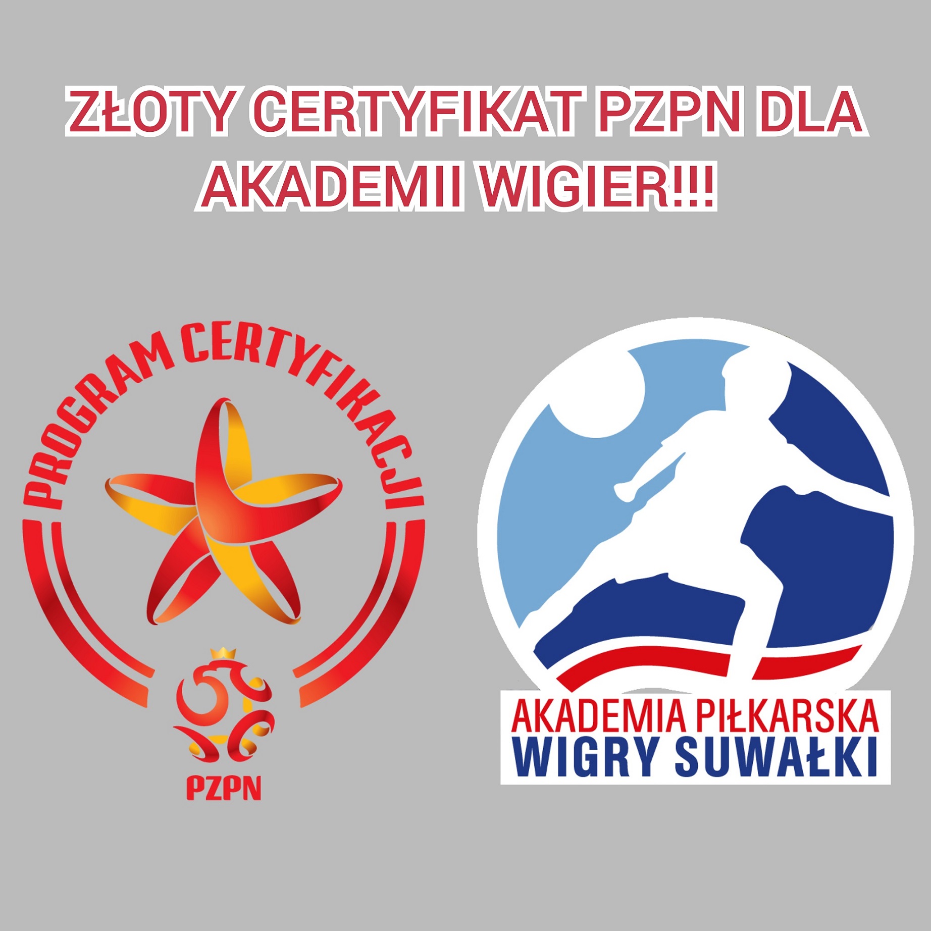 W piÄ…tek, 29 listopada Polski ZwiÄ…zek PiÅ‚ki Nożnej wydaÅ‚ komunikat o przyznaniu Certyfikatów PZPN szkóÅ‚kom piÅ‚karskim, które speÅ‚niÅ‚y kryteria formalno-prawne. WÅ›ród 117 szkóÅ‚ek, które otrzymaÅ‚y zÅ‚otÄ… gwiazdkÄ™, znalazÅ‚a siÄ™ również Akademia PiÅ‚karska Wigry SuwaÅ‚ki.