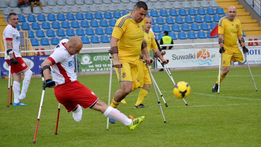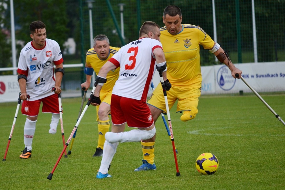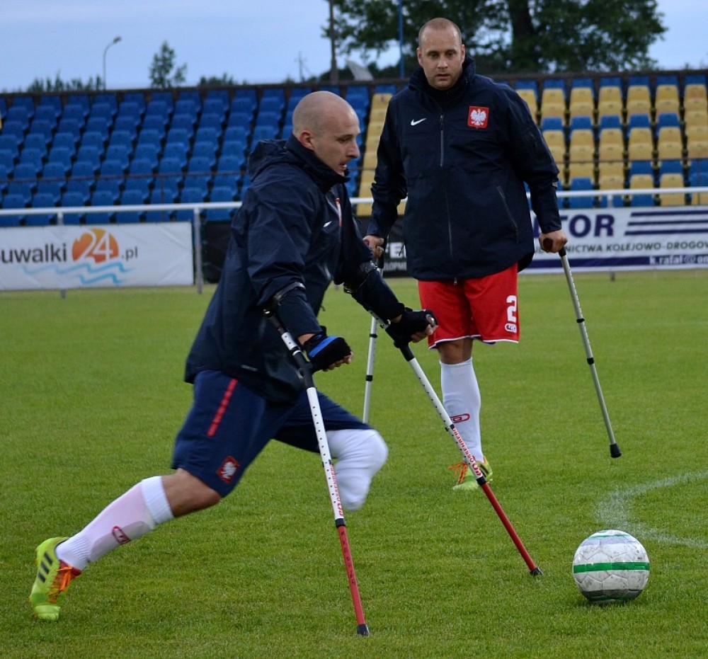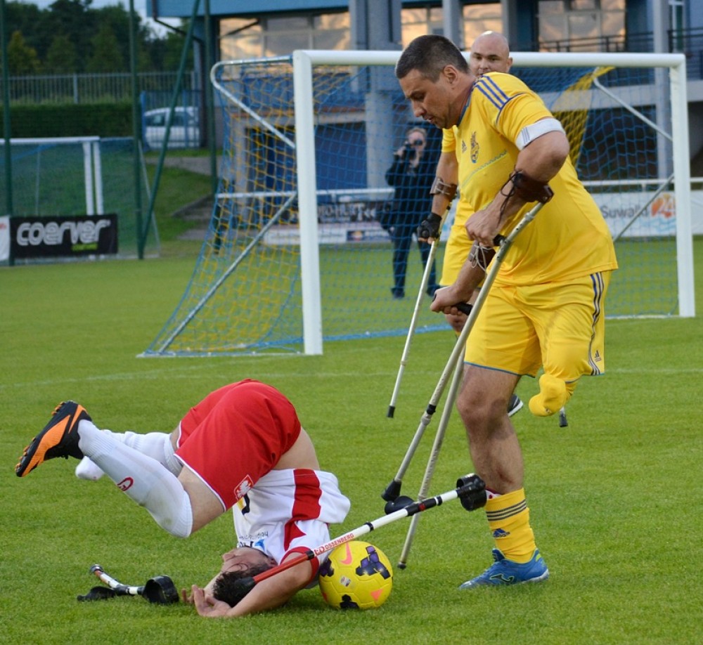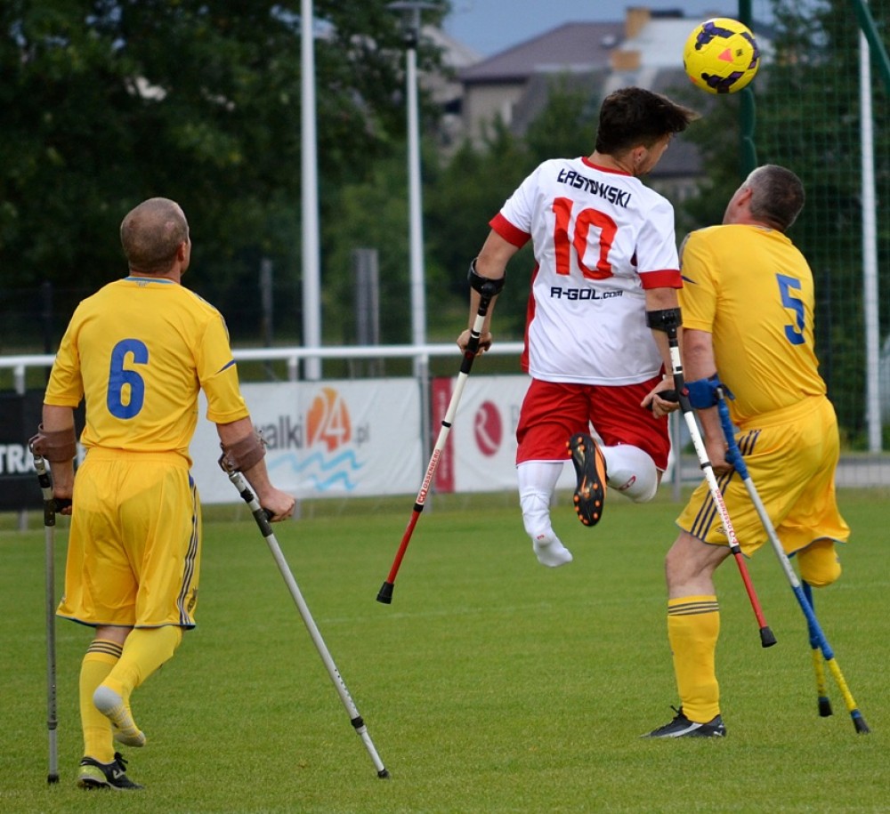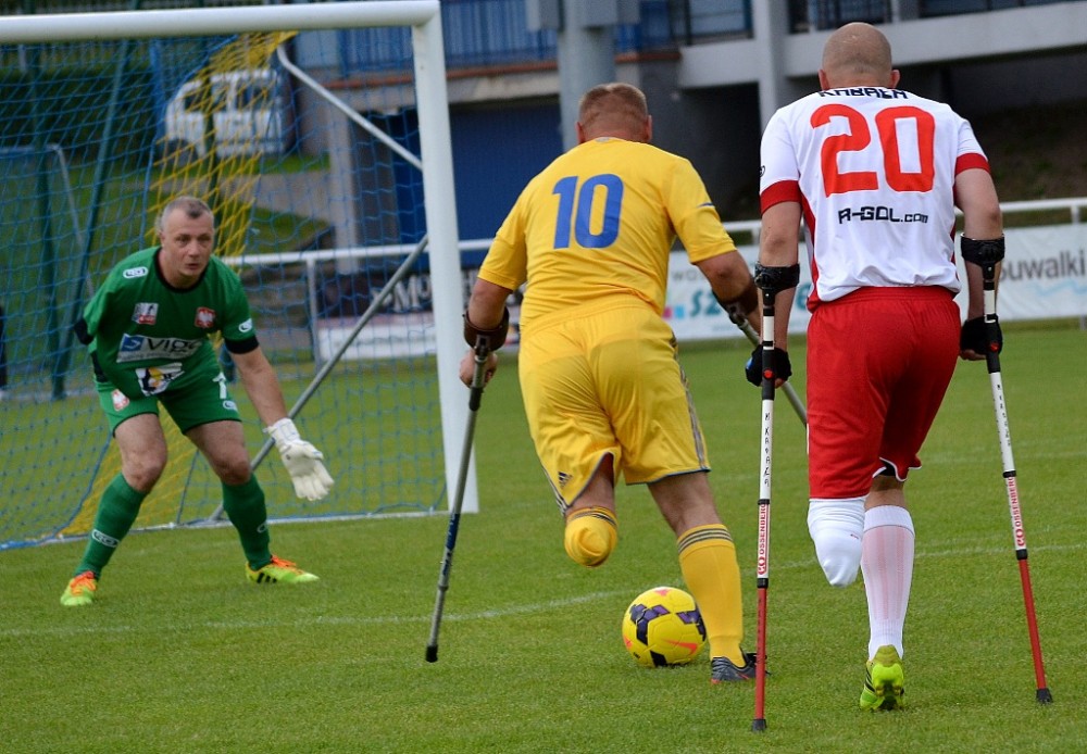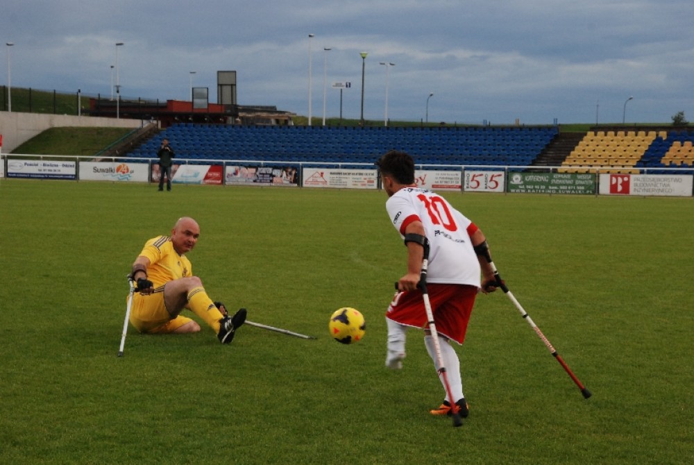 W rozegranym w sobotę w Suwałkach towarzyskim meczu amp futbolu (piłka nożna dla osób po amputacjach i osób z wadami kończyn; zawodnicy grający w polu są po amputacji nogi, a bramkarze po amputacji ręki) Polska pokonała 2:1 Ukrainę. W reprezentacji biało-czerwonych zadebiutował 17-letni ełczanin Dawid Dobkowski (na zdjęciu z lewej przy piłce).