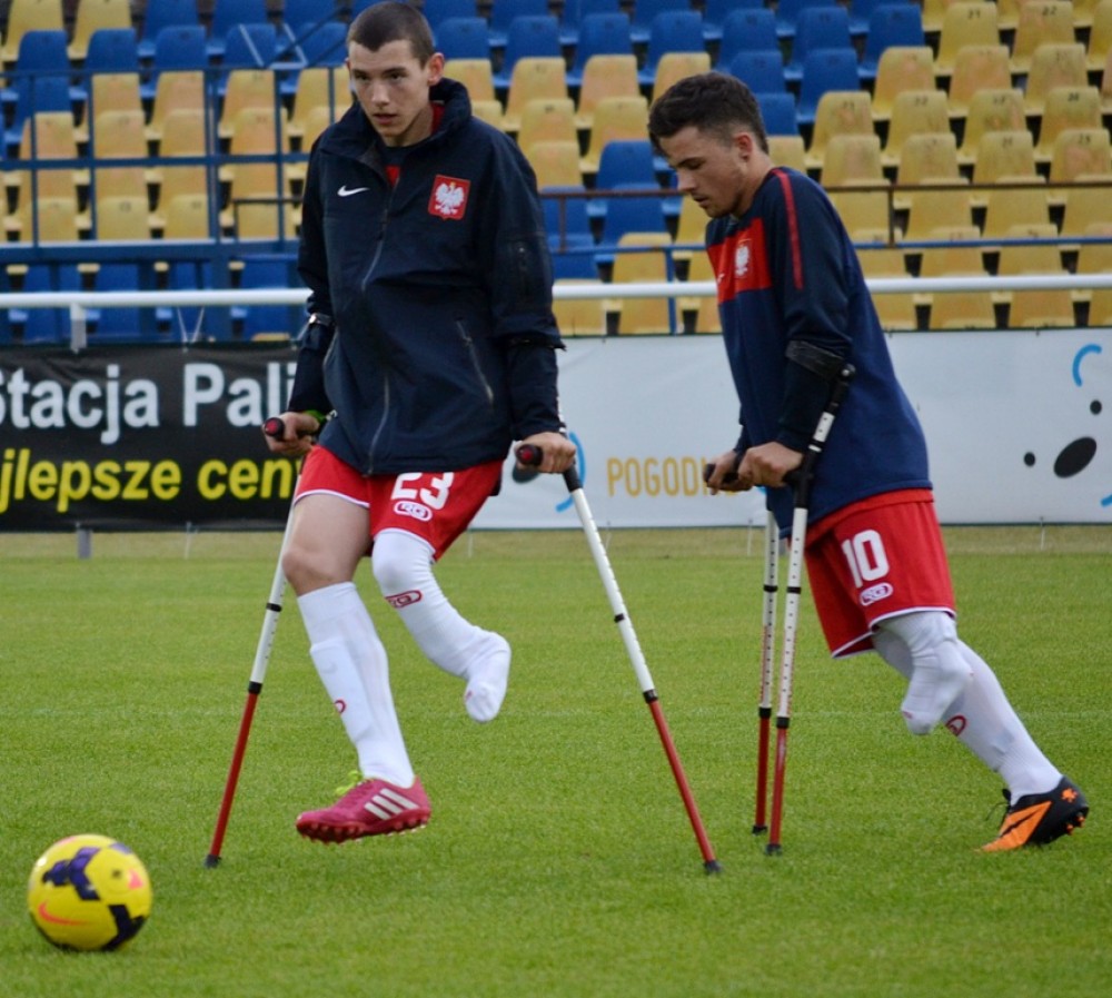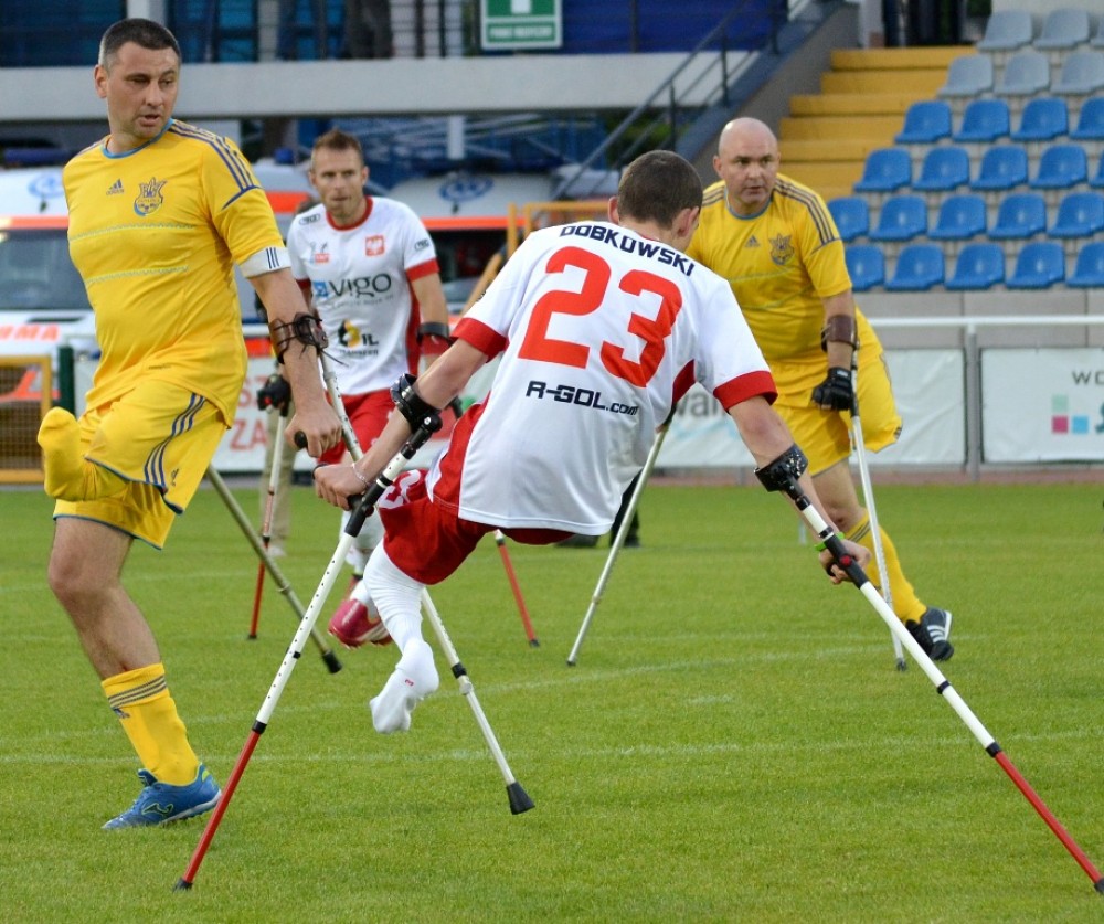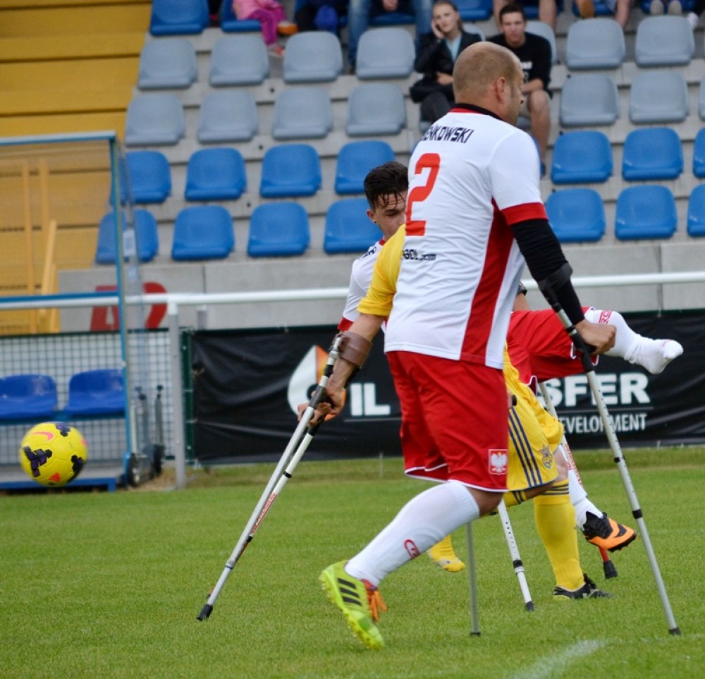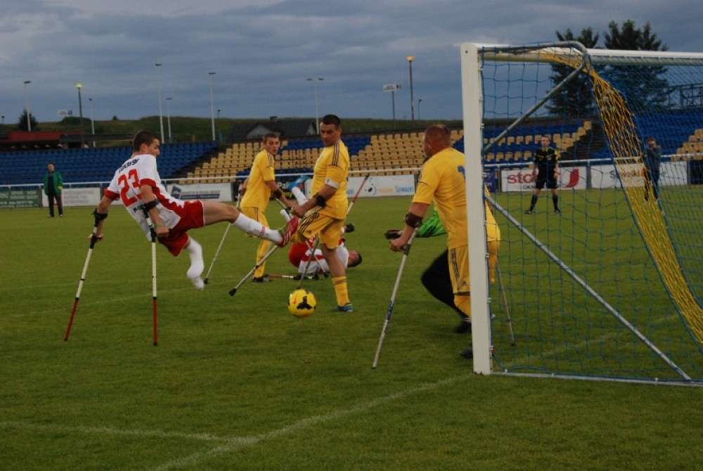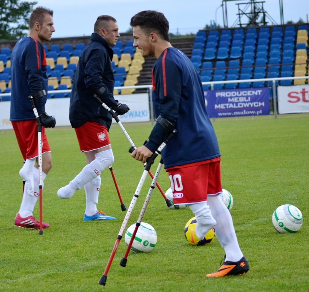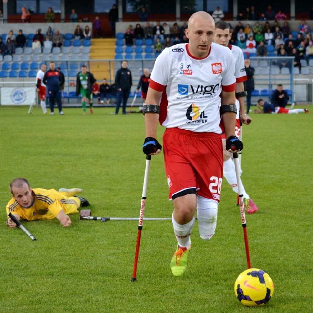 W rozegranym w sobotę w Suwałkach towarzyskim meczu amp futbolu (piłka nożna dla osób po amputacjach i osób z wadami kończyn; zawodnicy grający w polu są po amputacji nogi, a bramkarze po amputacji ręki) Polska pokonała 2:1 Ukrainę. W reprezentacji biało-czerwonych zadebiutował 17-letni ełczanin Dawid Dobkowski (na zdjęciu z lewej przy piłce).