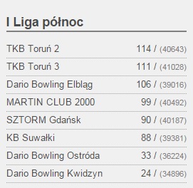 Z racji dużego zainteresowania bowlingiem w naszym regionie powstaÅ‚a druga drużyna, która gra w II Lidze PóÅ‚nocy-Wschód. WiesÅ‚aw Frydrych, Anita Szulc, RadosÅ‚aw Å»uchowski i Robert Chodorowski po dwóch pierwszych kolejkach i dwunastu punktach na koncie zajmuje piÄ…te miejsce w tabeli. Prowadzi z dużą przewagÄ… zespóÅ‚ CENTRUM U7 GDYNIA 2. Czekamy na kolejne zwyciÄ™stwa i punkty.