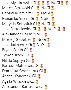 Podopieczni trenerów Anety StaÅ›kiewicz i MiÅ‚osza StaÅ›kiewicza siÄ™gnÄ™li po sukcesy zarówno w walkach Gi (w kimonach), jak i NoGi (koszulki i spodenki). Ich indywidualny dorobek zÅ‚ożyÅ‚ siÄ™ na puchar za III miejsce suwalskiego klubu w klasyfikacji drużynowej.