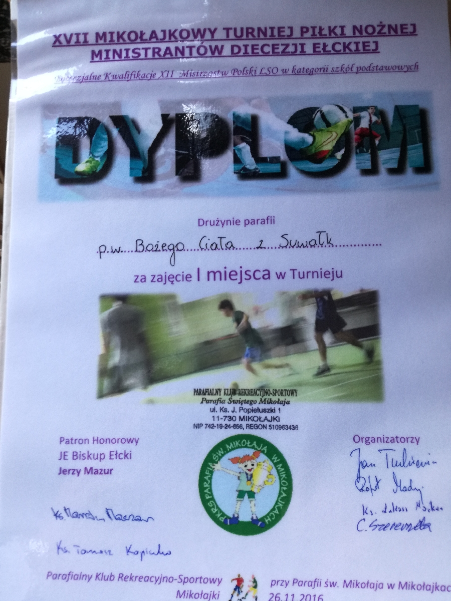 Zwycięstwem piłkarzy z prowadzonej przez Ojców Franciszkanów parafii Bożego Ciała w Suwałkach zakończył się rozegrany w Mikołajkach z udziałem 16 drużyn XVII Mikołajkowy Turniej piłki Nożnej ministrantów ze szkół podstawowych diecezji ełckiej, który był eliminacjami do XII Mistrzostw Polski Liturgicznej Służby Ołtarza (1-2.06.17 Częstochowa). Suwalczanie powtórzyli sukces sprzed czterech lat.