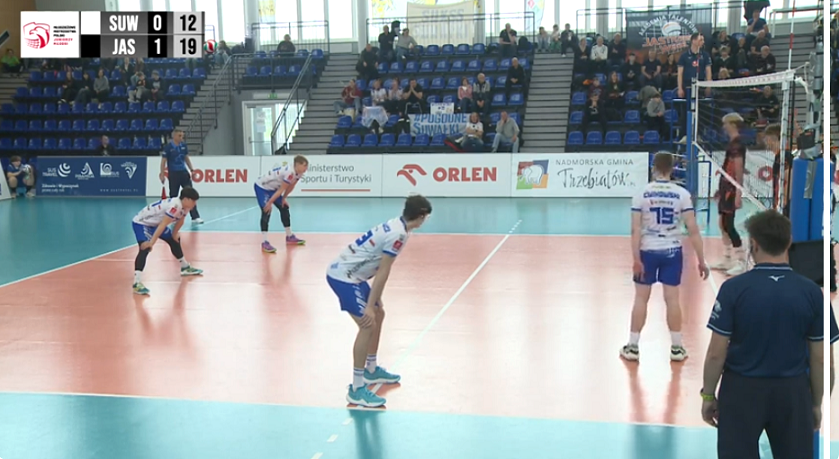 W trzecim secie suwalczanie za wszelką cenę dążyli do przedłużenia spotkania, a ich zdekoncentrowani rywale lekko spuścili z tonu. Oglądaliśmy obfitującą w obrony, długie akcje, piękna walkę. Ze stanu 11:15, SUKSS nawiązał kontakt na 15:16, miał piłkę po swojej stronie, ale akcję środkiem źle rozegrali Bartosz Ćwikowski i Bartosz Sawicki. Stracona szansa na wyrównanie zdeprymowała Biało-Niebieskich. Gracze Jastrzębskiego odskoczyli na 19:16, trzeciego seta wygrali 25:20 i mecz 3:0.