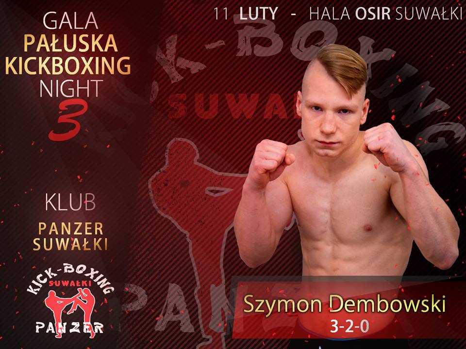 Szymon Dembowski, wychowanek PANZERA, z którym związany jest od 2014 roku. Uczestnik m.in Mistrzostw Polski oraz Międzynarodowych Mistrzostw Litwy. W zawodach mistrzowskich, które odbyły się w Wilnie, w formule K1 zdobył brązowy medal. W sobotę 11 lutego zamierza potwierdzić, iż jest perspektywicznym zawodnikiem, o którego sukcesach z pewnością jeszcze nie raz usłyszymy.