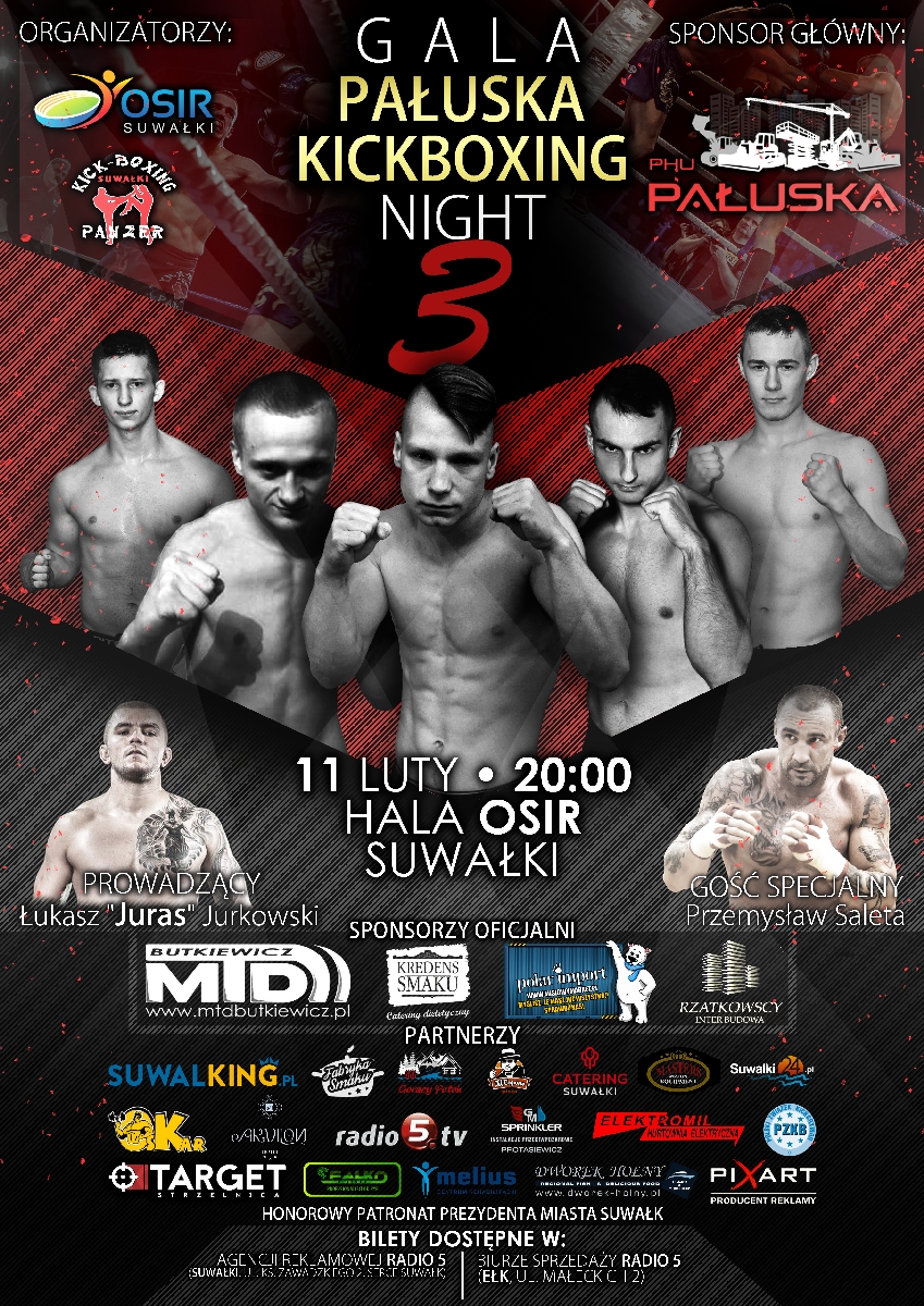 - Od samego początku głównym celem projektu była promocja Miasta Suwałk oraz działającego w nim klubu PANZER Suwałki, którego wychowankowie mogli zaprezentować się przed blisko tysięczną publicznością zgormadzoną w hali suwalskiego OSiR-u – mówi Dominik Szczodruch. - Z uwagi na wartość marketingową projektu, Pałuska Kickboxing Night 3 ma wymiar także biznesowy, czego dowodem jest duże zainteresowanie mediów i przygotowana na najwyższym poziomie oprawa zawodów. Ważnymi aspektami, na które organizatorzy Pałuska Kickboxing Night 3 kładą nacisk, są poziom sportowy oraz organizacyjny gali. W III edycji zawodów odbędzie 11 walk w najbardziej efektownych kategoriach tej dyscyplinie tj. K1 i Full Conatact, podczas których zaprezentuje się pięciu zawodników klubu Panzer Suwałki. Podczas gali odbędzie się również oficjalny mecz kickboxingu Polska - Litwa, w którym wezmą udział zawodnicy z federacji DSF Kickboxing Challenge.