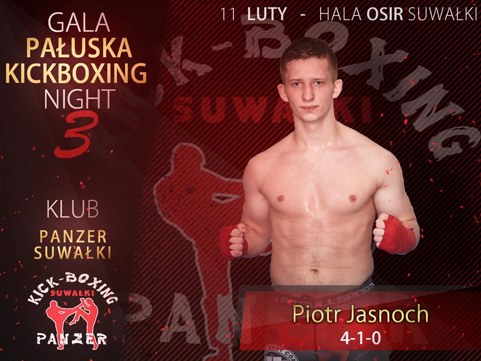 Piotr Jasnoch, zawodnik augustowskiej sekcji Kickboxing Panzer Suwałki. Piotrek trenuje od 6 lat. Na swoim koncie ma m.in. tytuł v-ce Mistrza Polski Kick-Light Kartuzy 2016 oraz zwycięstwo w Międzynarodowych Mistrzostwach Litwy (2016).