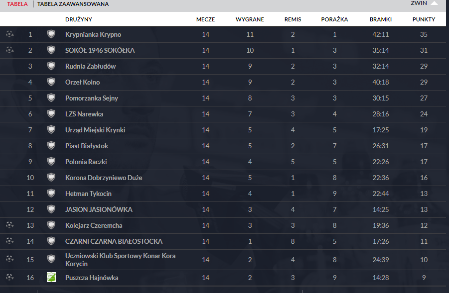 Z bardzo dobrego trzeciego na piąte miejsce spadła Pomorzanka Sejny. Zespół Andrzeja Spury przegrywał z Orlem Kolno 0:2, by w ciągu minuty, po trafieniach Kuby Januszewicza i Adama Miszkiela, doprowadzić do remisu. Niestety, w samej końcówce goście, z grającym trenerem Ireneuszem Piwko, ponownie przechylili szalę na swoją korzyść. Dwie bramki dla Orła strzelił rezerwowy Marcin Nerko.