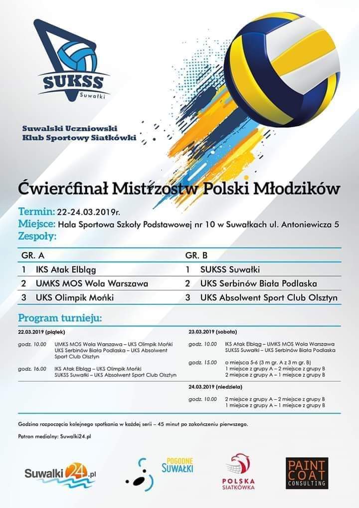 Od piątku do niedzieli w hali SP 10 rozgrywany będzie ćwierćfinałowy turniej Mistrzostw Polski Młodzików w siatkówce. Gospodarzem imprezy jest SUKSS Suwałki.