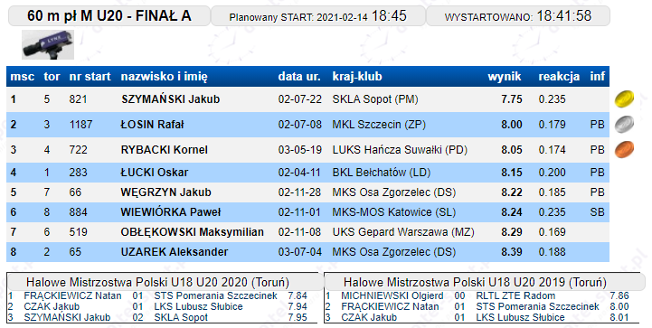 W finale Jakub Szymański "odpalił" tuż po starcie i wygrał zdecydowanie - 7.75. W zaciętej rywalizacji o srebro lepszy był Rafał Łosin - 8.00, a zawodnik Hańczy wywalczyl brąz, znowu bijąc rekord życiowy o 4 setne - 8.05.