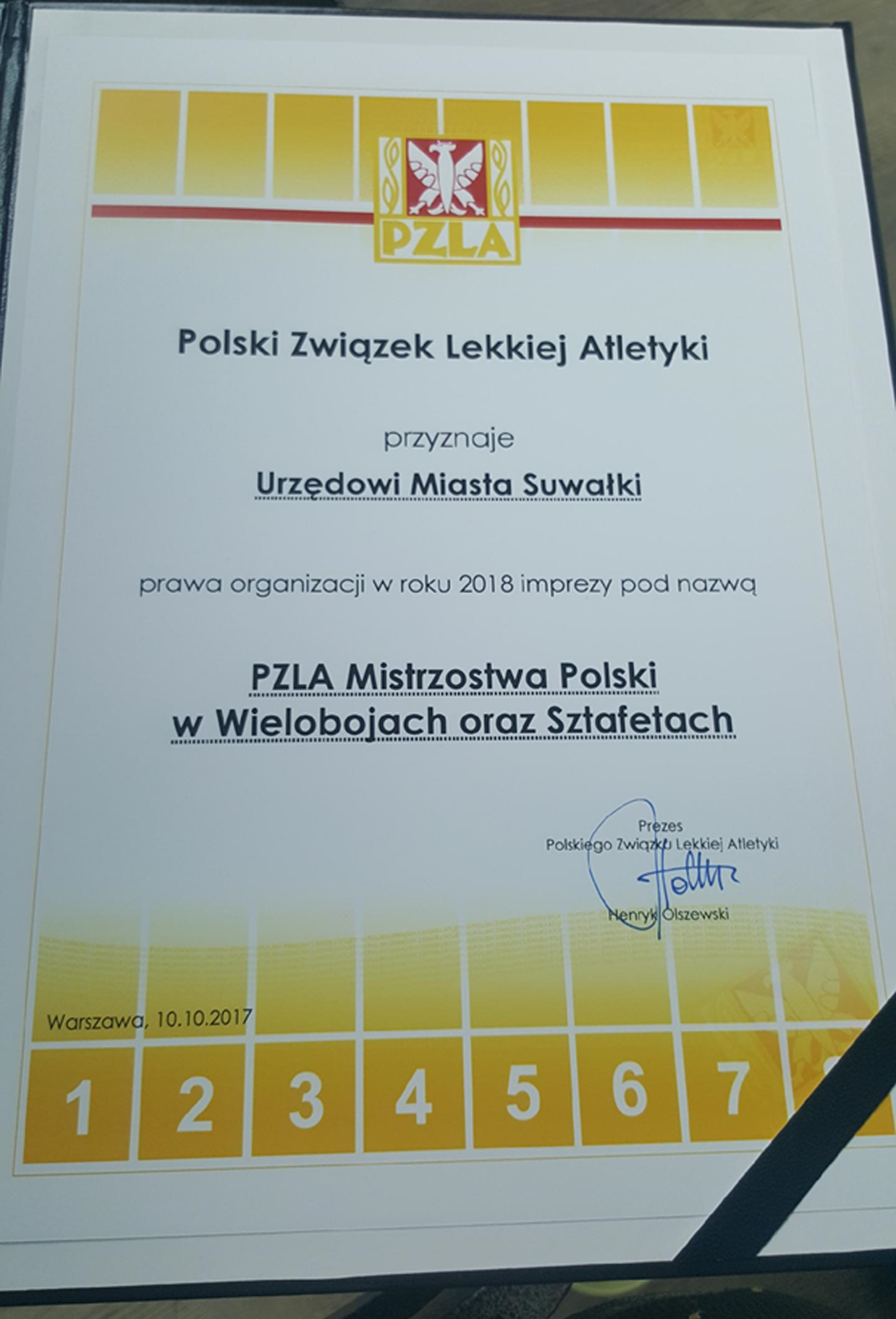 Dziś (10.10.2017 r.) w samo południe w Centrum Olimpijskim im. Jana Pawła II w Warszawie odbyło się spotkanie organizatorów przyszłorocznych PZLA Mistrzostw Polski. Już trzeci rok z rzędu w gronie wyróżnionych miast-gospodarzy najważniejszych imprez lekkoatletycznych w Polsce znalazły się Suwałki. Obecny na spotkaniu Czesław Renkiewicz, Prezydent Miasta Suwałk, otrzymał z rąk Henryka Olszewskiego, twórcy sukcesów m.in. Tomasza Majewskiego i Krystyny Zabawskiej (z domu Danilczyk), a obecnie Prezesa zarządu Polskiego Związki Lekkiej Atletyki, okolicznościową nominację. W 2018 roku Suwałki będą gospodarzem PZLA Mistrzostw Polski w Wielobojach oraz Sztafetach. O medale lekkoatleci rywalizować będą w drugi weekend czerwca (9-10).