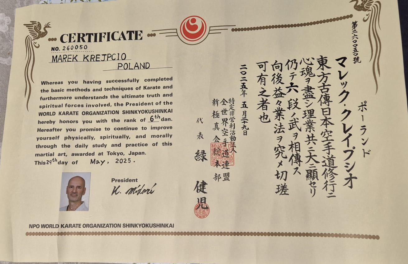 - Egzaminy na stopnie mistrzowskie zdaje się do 5 dan - przed komisją europejską lub w samej Japonii. Później dostaje się honorowe stopnie za zasługi i działalność w organizacji – informuje suwalski klub. - Shinan Marek dostał już certyfikat z Japonii i dumnie może zawiązać swój 6 dan na brzuchu. Niech się dobrze nosi, służy i dodaje mocy wewnętrznej. Osu!
