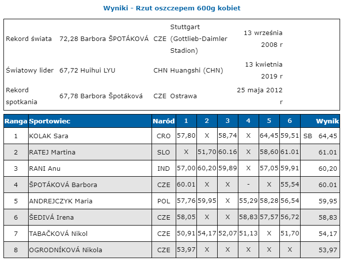Jeżeli do tych przeciwnoÅ›ci dodać stres zwiÄ…zany z rywalizacjÄ… po bardzo dÅ‚ugiej przerwie z zawodniczkami ze Å›cisÅ‚ej czoÅ‚ówki Å›wiatowej, to pierwszy w sezonie (nie liczÄ…c marcowego startu w Zimowym Pucharze Europy w rzutach - 60,56 m) wystÄ™p podopiecznej trenera Karola Sikorskiego trzeba uznać za bardzo udany.