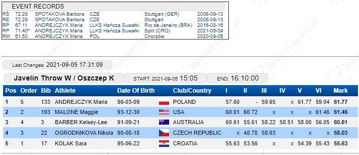 Silnie obsadzony konkurs rzutu oszczepem wygraÅ‚a srebrna medalistka z Pekinu Maria Andrzejczyk. Zawodniczka LUKS HaÅ„cza SuwaÅ‚ki w najlepszym rzucie osiÄ…gnęła 61.77 m i wyprzedziÅ‚a 10. w Tokio AmerykankÄ™ Maggie Malone - 61.46 m oraz brÄ…zowÄ… medalistkÄ™ ostatnich igrzysk, AustralijkÄ™ Kelsey-Lee Barber - 60.61 m, którÄ… pokonaÅ‚a w Japonii różnicÄ… 5 cm.