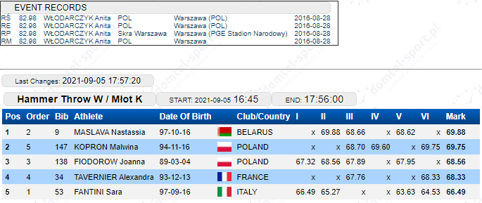 W rzucie młotem trzecie miejsce zajęła pochodząca z Augustowa 32-letnia Joanna Fiodorow, finalistka (po raz trzeci z rzędu) konkursu olimpijskiego w Tokio.