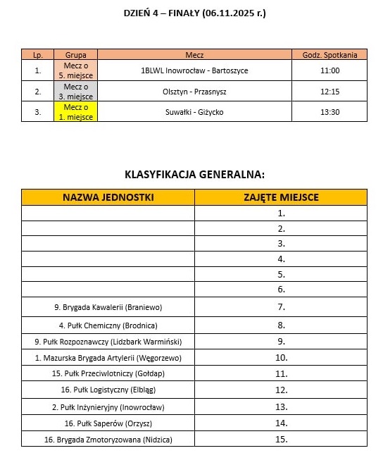 Wielki finaÅ‚ zaplanowany jest na godz. 13:30. Czwartek w SuwaÅ‚ki Arenie już o godz. 11:00 rozpocznie mecz o 5. miejsce, w którym wystÄ…piÄ… 1 Brygada Lotnictwa Wojsk LÄ…dowych InowrocÅ‚aw i 20 Bartoszycka Brygada Zmechanizowana. W meczu o brÄ…z, wyznaczonym na 12:15, spotkajÄ… siÄ™ 9 OlsztyÅ„ski Batalion Dowodzenia i 2 OÅ›rodek Radioelektroniczny Przasnysz.
